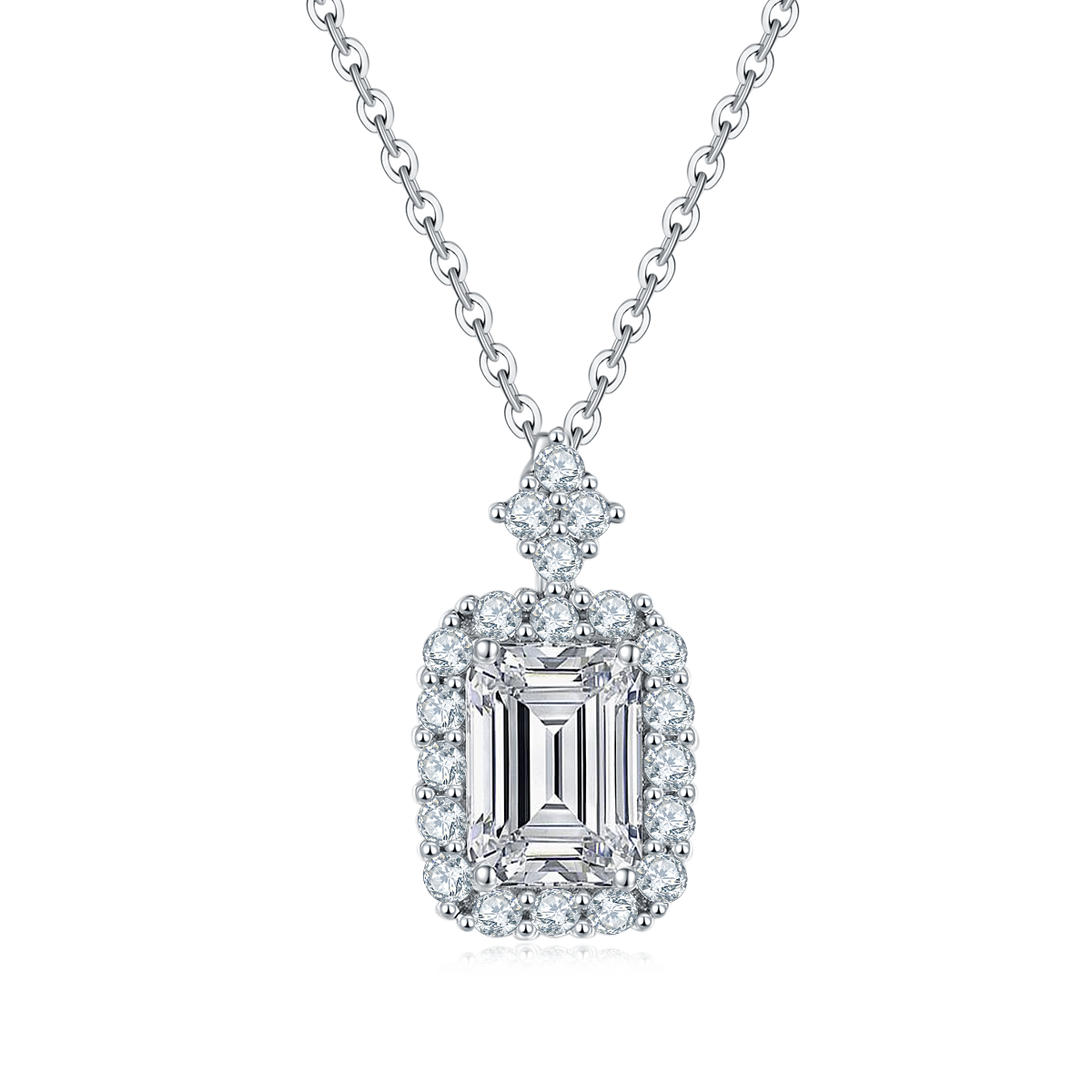 1.0 Carat Emerald Cut Moissanite Pendant with Soleste Halo in S925 Silver-Plated Platinum Necklace