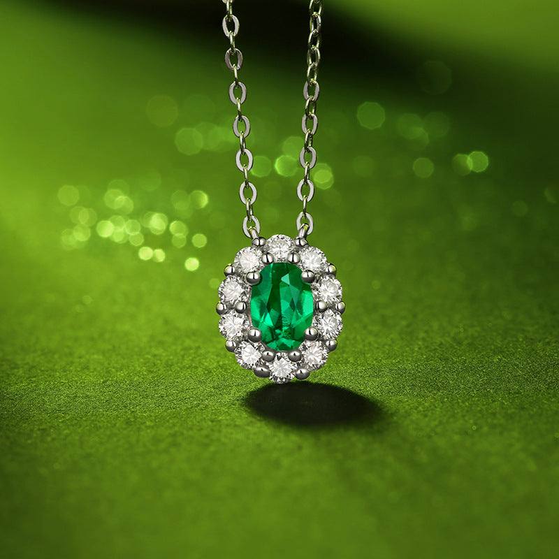 (1.0CT) Lab-Created Emerald Oval Ice Cut Soleste Halo Pendants Silver Necklace for Women