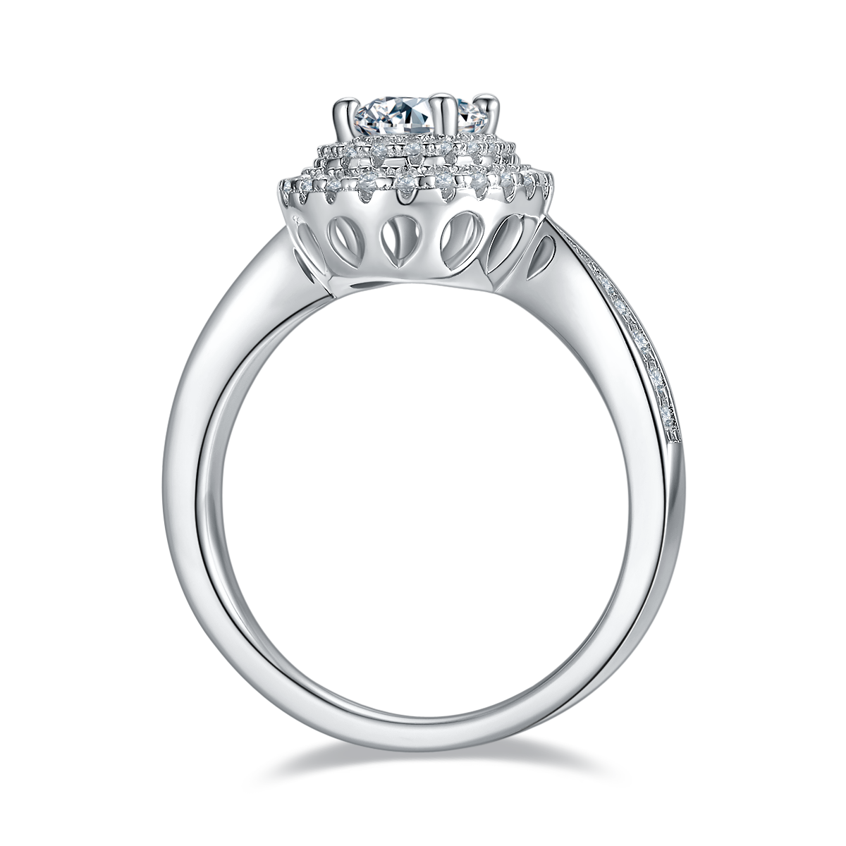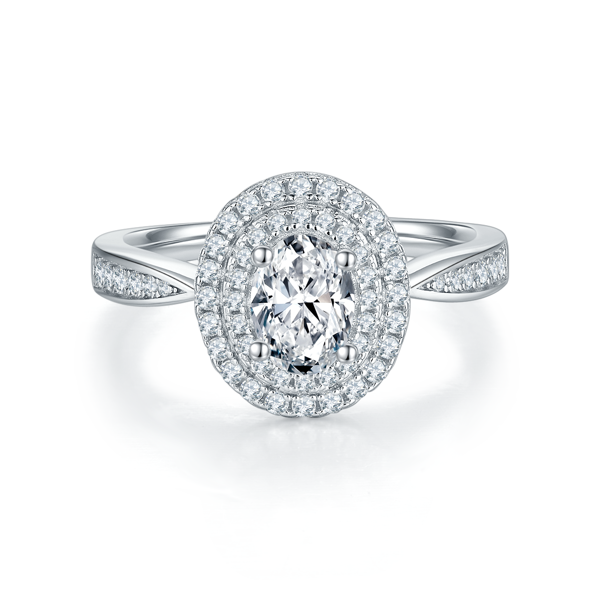 This luxurious and eye-catching ring is designed for women who desire a bold and sophisticated piece of jewelry. It features 1.0 carat oval shape Moissanite stone. Multiple small Moissanite are inlaid on the ring and the unique double halo design making the entire ring more luxurious and sparkly.