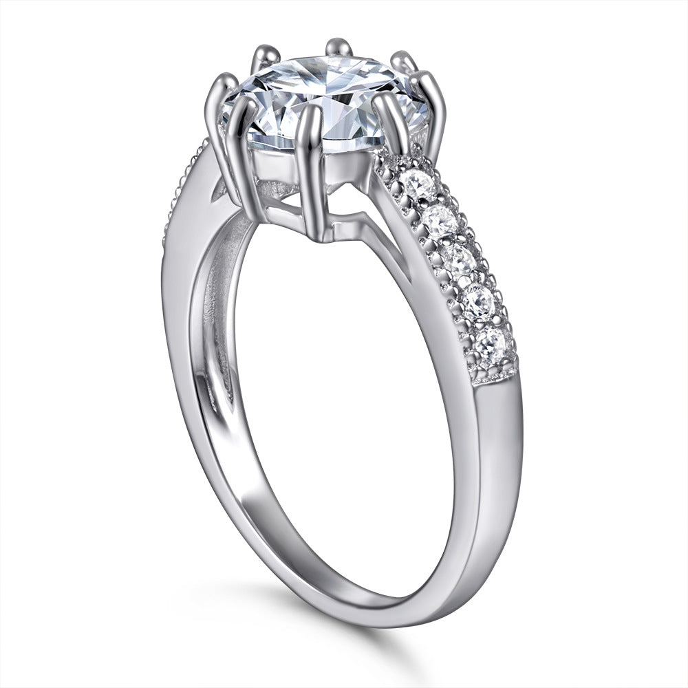 This classic 1.0CT Eight Prongs Round Zircon ring for women features a Cathedral style and a timeless design. It features a perfectly cut and luminescent round Zircon centerpiece, expertly set in a sturdy sterling silver ring band decorated with small zircons, to ensure lasting quality. Graceful and elegant, this ring is the perfect choice for any formal occasion.
