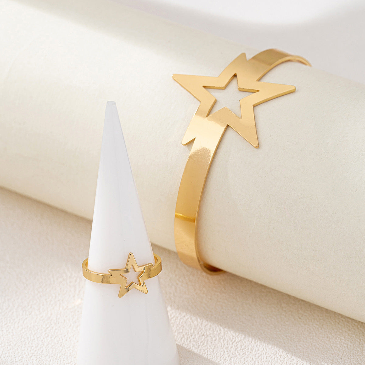 Minimalist Metal Pentagram Bracelet and Ring Set for Women