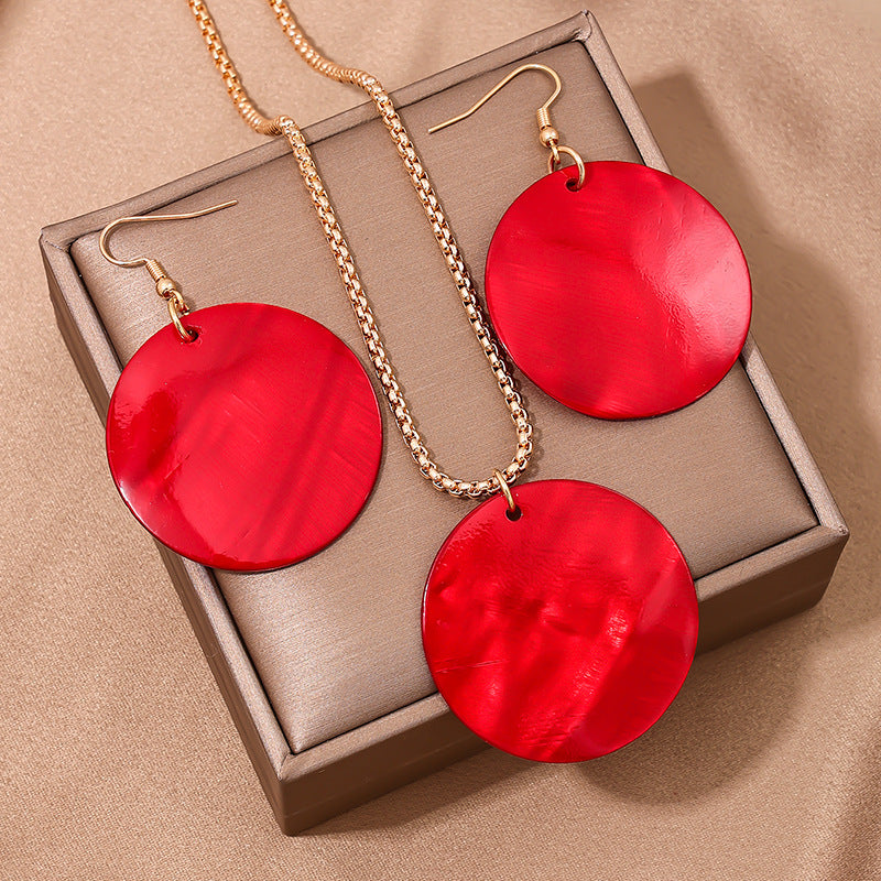 Unleash your inner fashionista with our stunning Fashion Color Holiday Style Red Disc Shell Pendant Cross-border Temperament Necklace Earrings Set. Elevate your look and make a bold statement with this exquisite set that exudes elegance and charm.