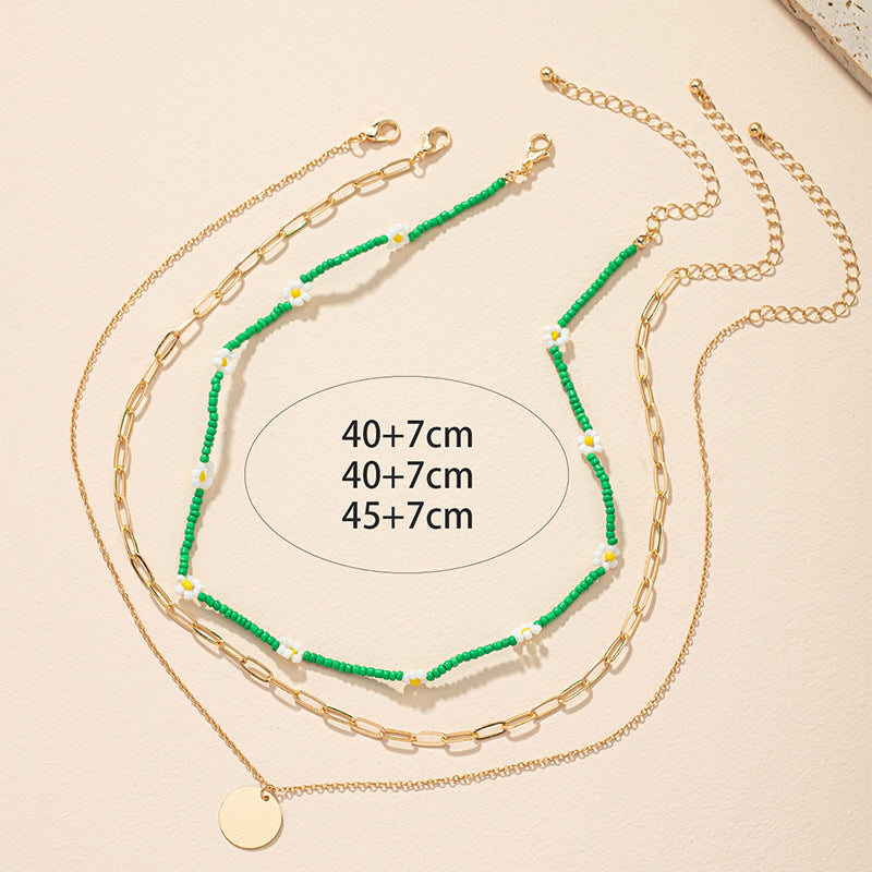 Green Floral Beaded Clavicle Chain Necklace Set - Three-Layer Medal Necklace