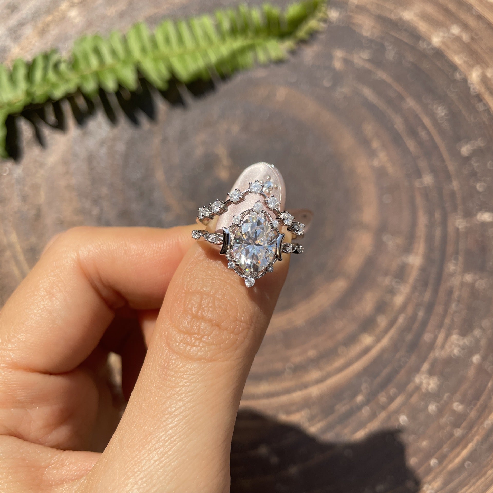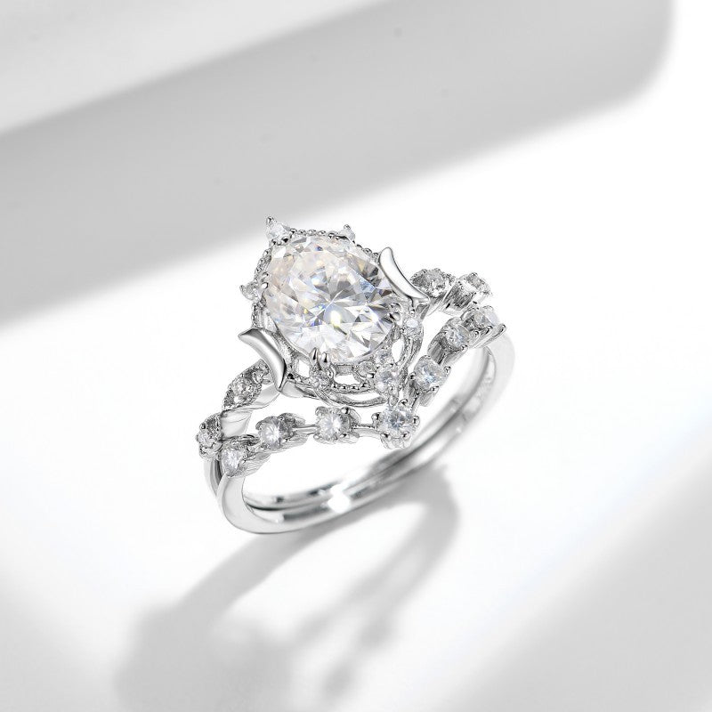 Elevate your style with the star moon series 7 * 9mm 2 carat oval-shaped moissanite stacked wearing ring, crafted from high-quality S925 silver-plated with 18k Platinum. This stunning engagement ring set is designed for those who appreciate elegance and versatility.