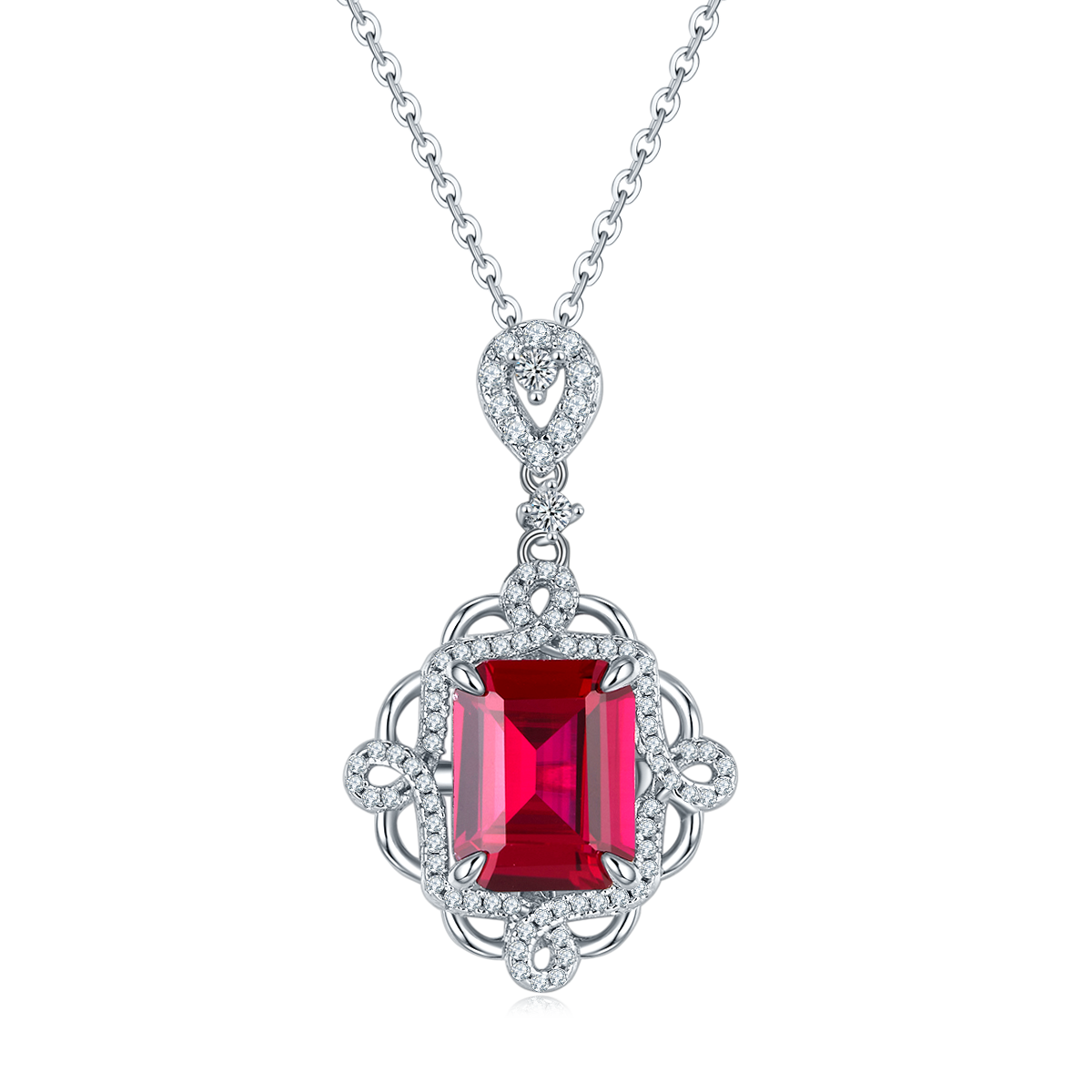 Elevate your jewelry collection with our stunning 4.23 carat rectangular Lab Created Ruby necklace, intricately designed with a palace style rhombus lace pattern. This exquisite piece is crafted from high-quality S925 silver plated with platinum, ensuring a luxurious shine and exceptional durability.