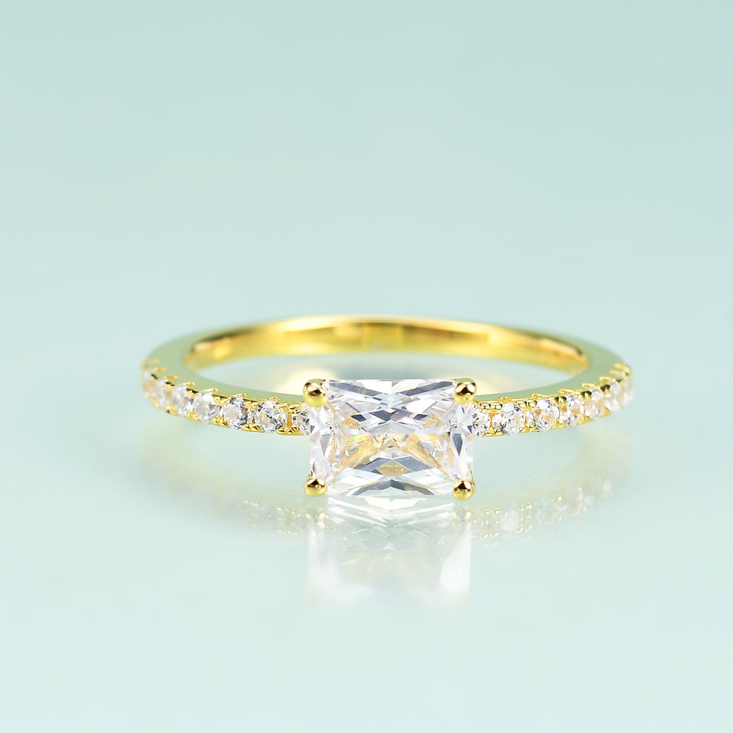 This elegant Golden 5A Zircon 14K Gold Plated on Silver Ring is perfect for any occasion. It boasts a rectangle zircon in the center, and is further decorated with small zircon on the ring arm for additional sparkle and shine.