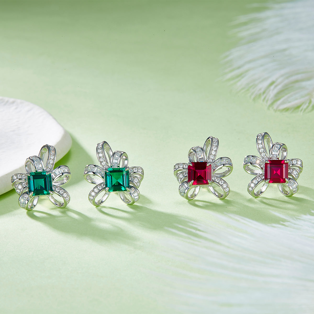 Discover the elegance of our 6*6mm emerald cut Lab Grown Gemstone S925 silver plated 18K platinum Ribbon knot stud earrings, a stunning addition to your jewelry collection. These exquisite earrings from the Planderful Gala Fireworks collection combine sophistication and sustainability, featuring ethically sourced gemstones that radiate beauty.