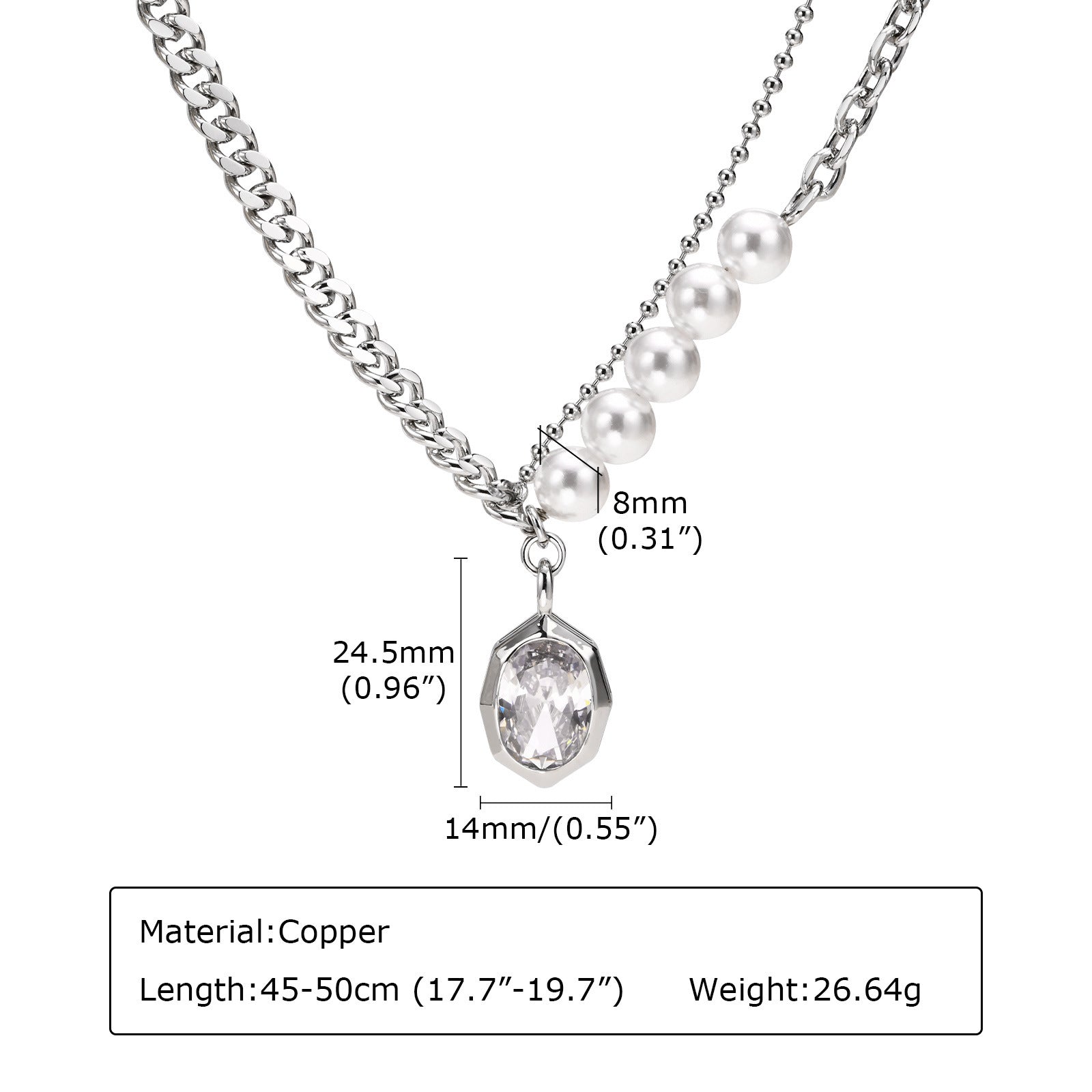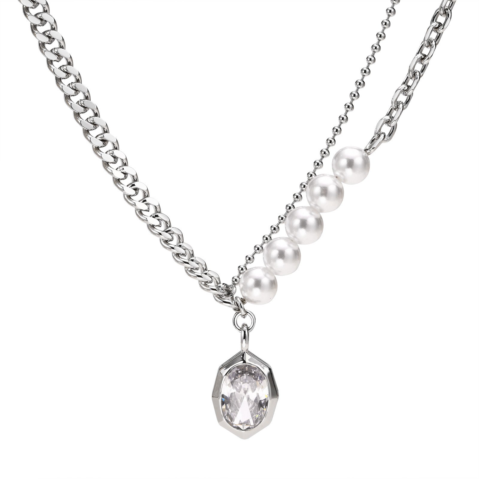 Introducing the captivating AB chain ins style personality fashion imitation pearl zircon geometric necklace female, irregular, copper material. This exquisite piece effortlessly merges contemporary design with classic elegance, making it the perfect accessory for any fashion-forward individual. Crafted from high-quality copper, this necklace showcases an alluring blend of imitation pearls and shimmering zircon stones, creating a stunning visual appeal that is sure to turn heads.