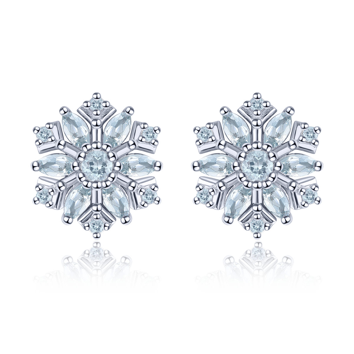 This earrings is an exquisite artwork, inspired by the winter snowflakes, symbolizing purity and beauty. The earrings are inlaid with aquamarine stone, with a colour resembling the mystery of the sea, emitting a charming luster.