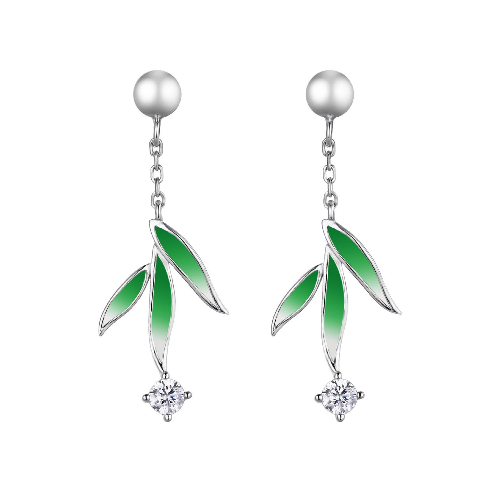 Gradient Bamboo Leaf with Zircon and Pearl Silver Drop Earrings for Women