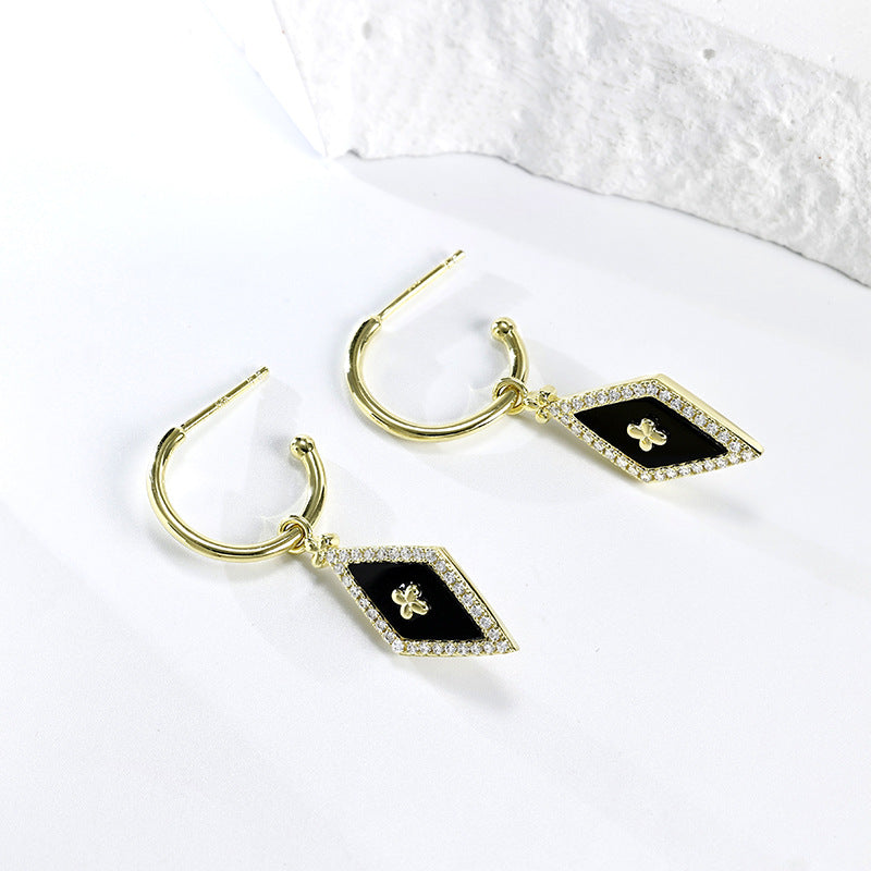C-shaped earrings paired with a rhombus shaped black agate pendant, black agate is a stone that can bring balance and strength, enhancing the wearer's inner strength and courage. The edge of the rhombus pendant is adorned with a circle of zircon, reflecting a dazzling light.
