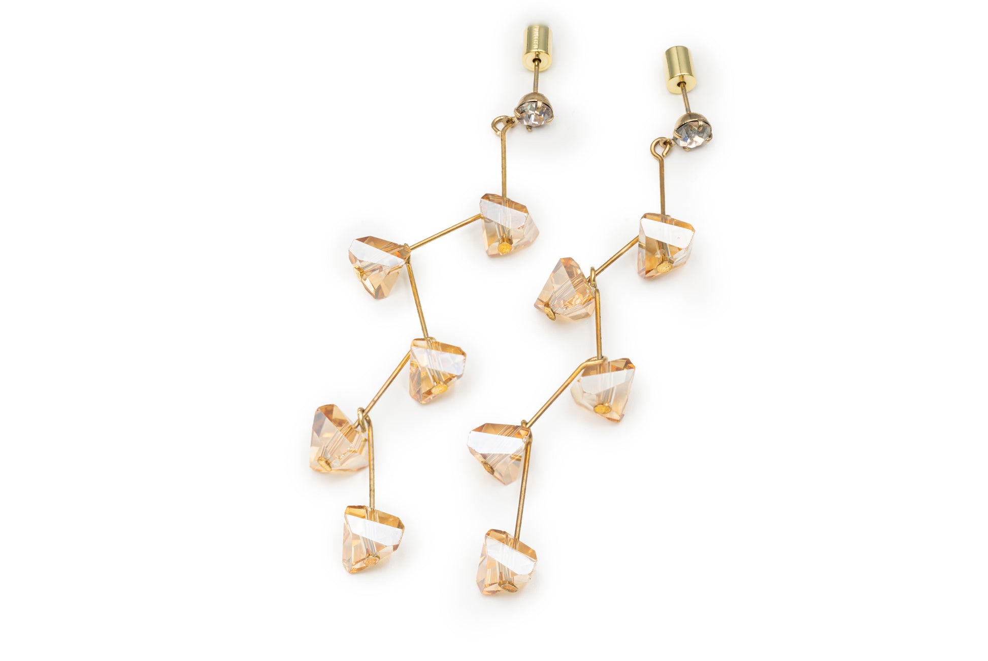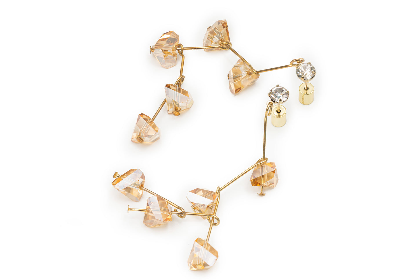 This drop earring is a unique pendant earring that features irregularity, showcasing beauty and personality. The earrings hang several irregularly shaped stones, with a transparent light brown colour, emitting a warm and soft luster. It implies creativity and inspiration.