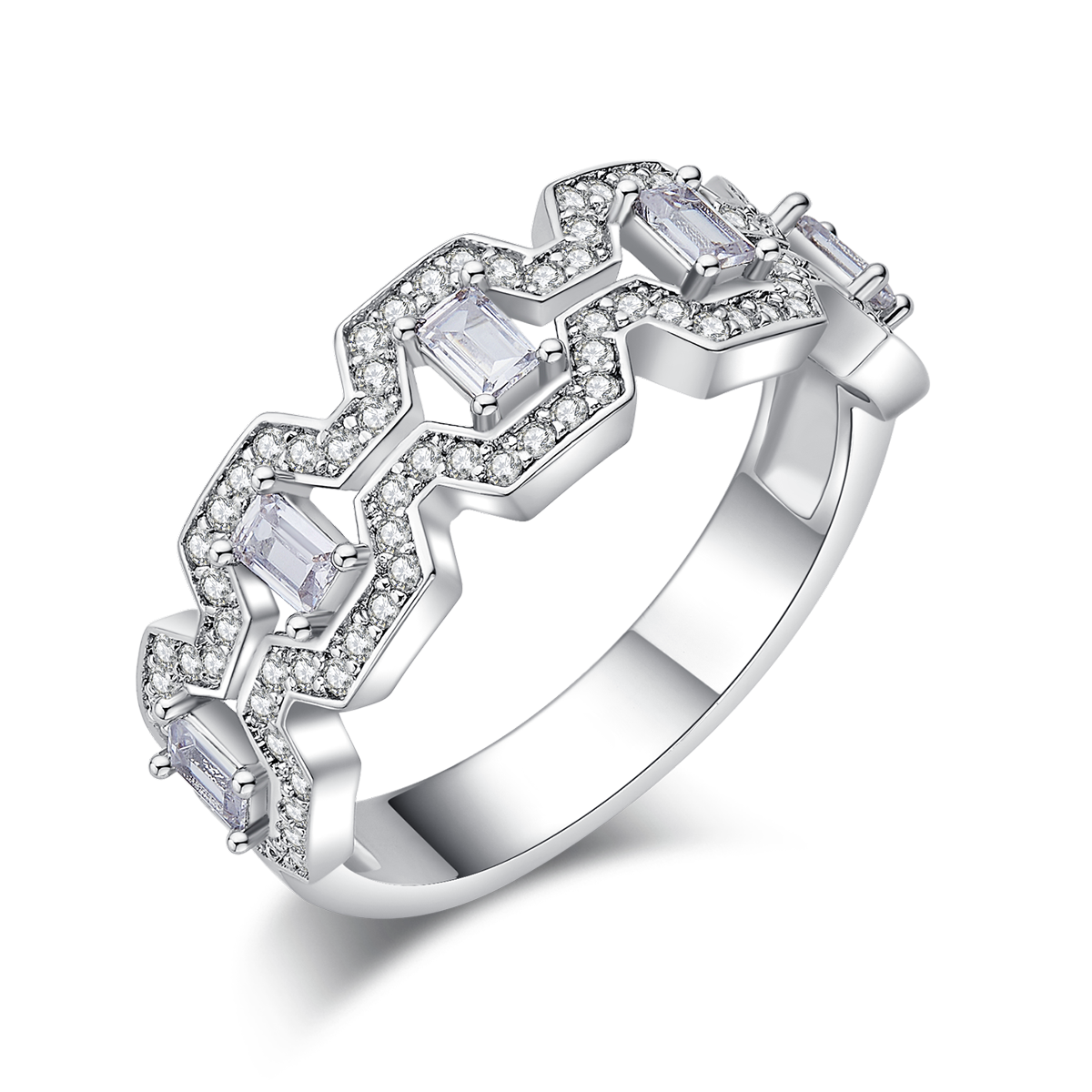 This luxurious and eye-catching ring is designed for women who desire a bold and sophisticated piece of jewelry. The concave & convex design with Emerald Cut Moissanite and multiple small stones is the characteristics of this ring that make this ring more gorgeous.