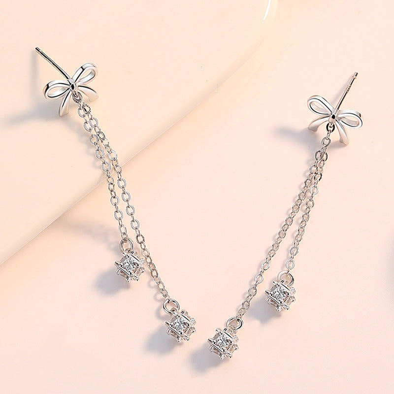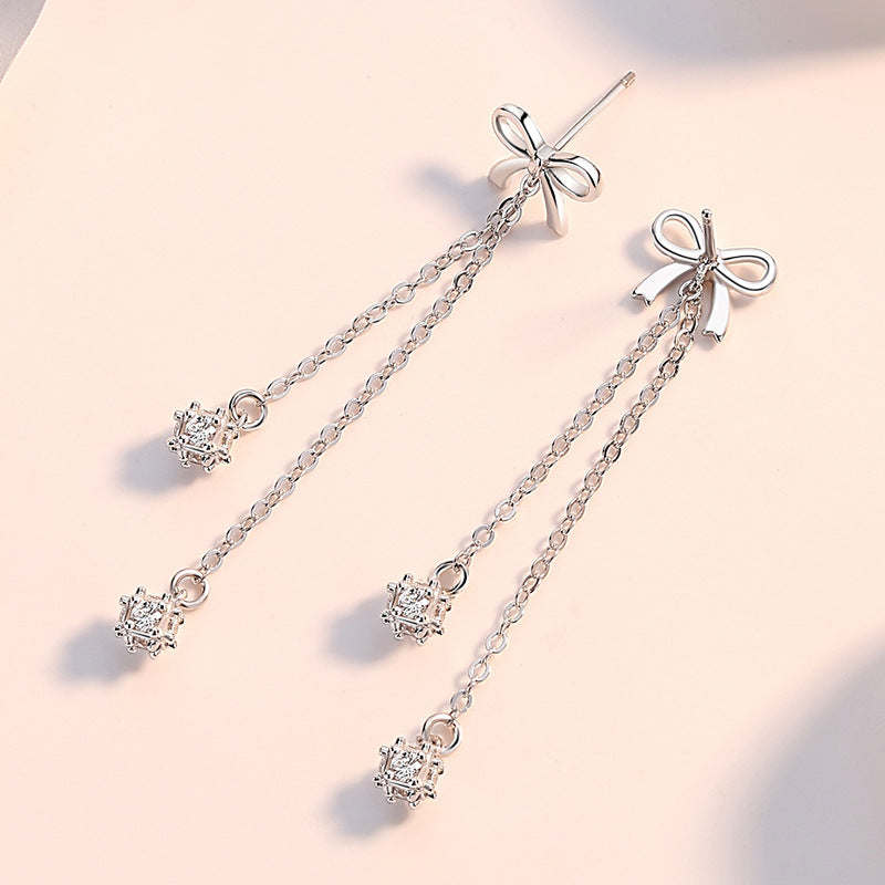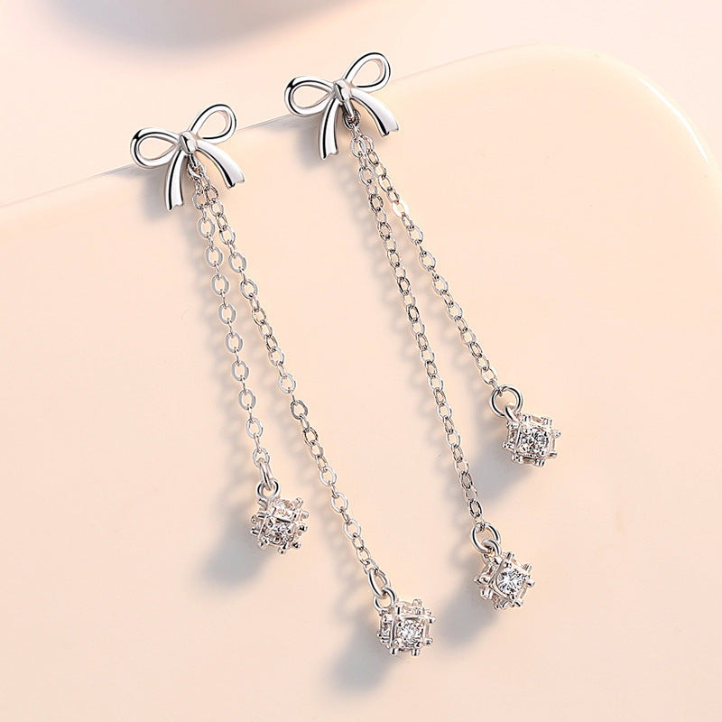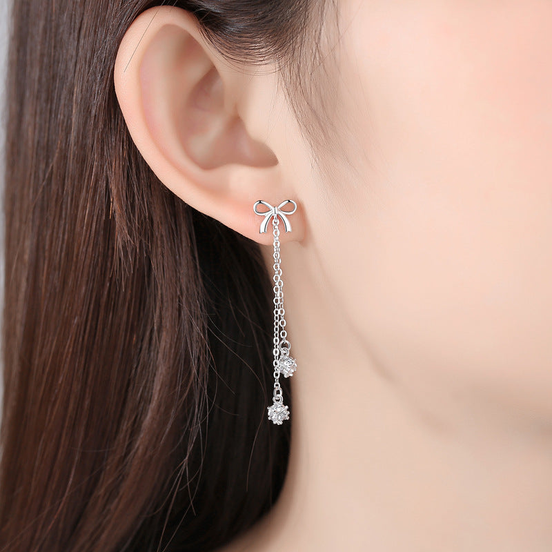Bow with Zircon Tassels Silver Drop Earrings for Women