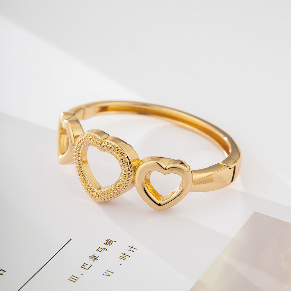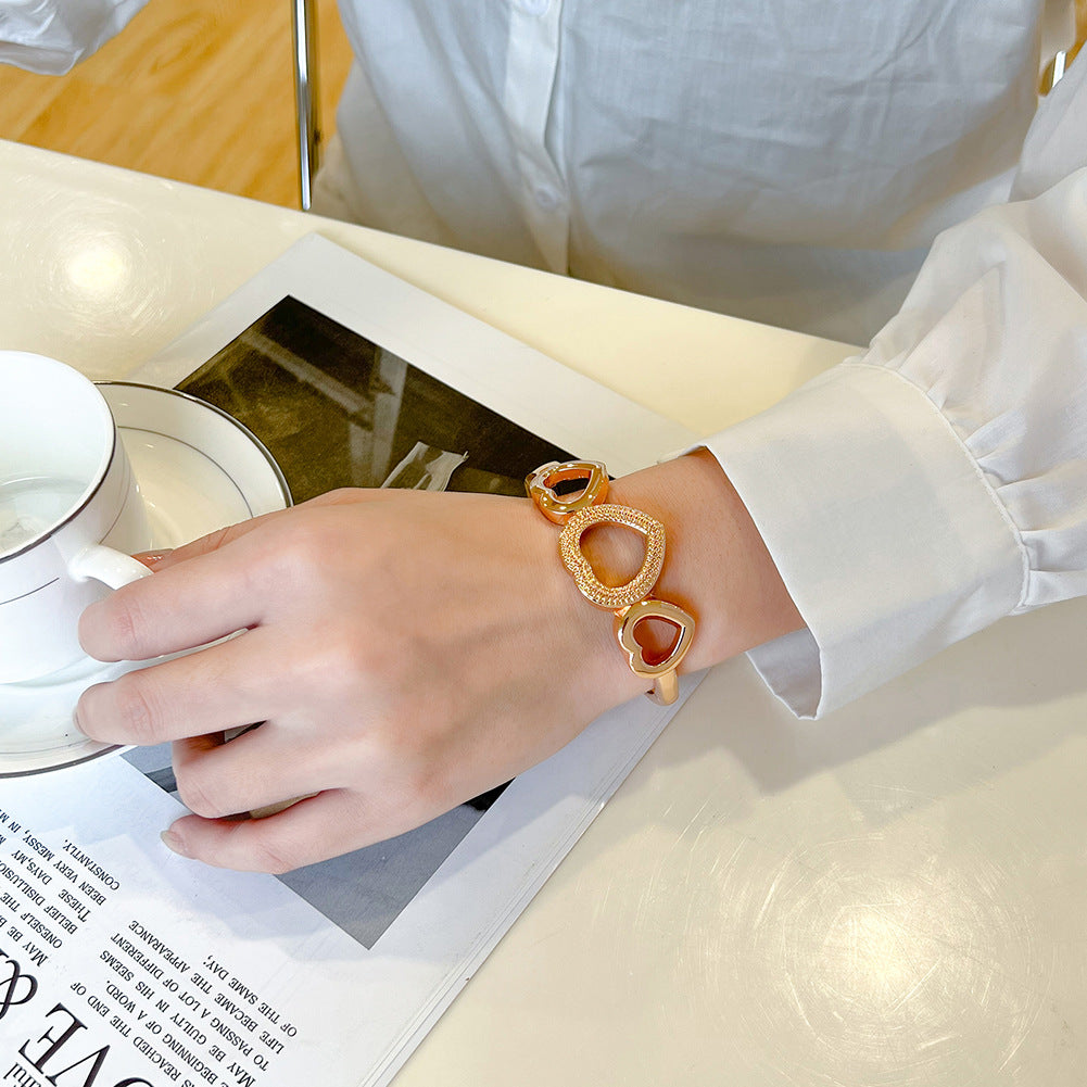 Elevate your style with this stunning Heart-shaped Bracelet from Planderful. Crafted from high-quality Titanium Steel Alloy, this bracelet is designed to never fade, ensuring long-lasting beauty. The intricate heart-shaped diamond inlay adds a touch of elegance and glamour to any outfit. Perfect for gifting or treating yourself, this original and personalized opening bracelet is a must-have accessory.