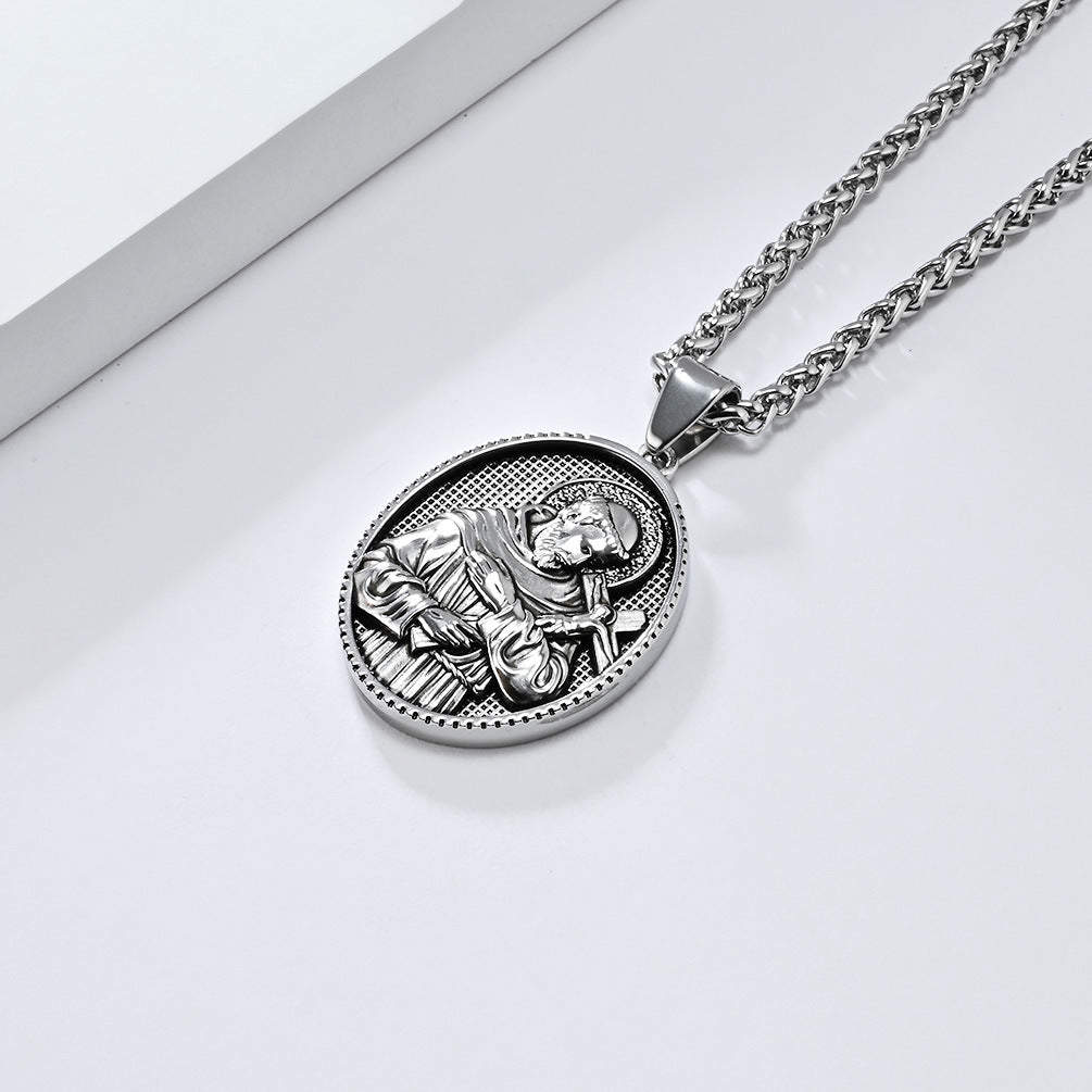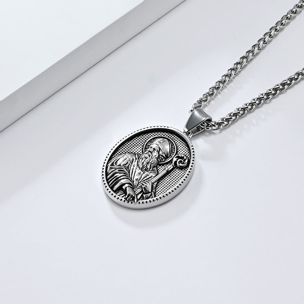Elevate your style with our Cross-border Europe and America Virgin Mary Titanium Steel Necklace Round Tag Pendant Holy Father Holy Son Jesus St. Benedict Body Accessories for men. This exquisite pendant is not just a fashion statement but a meaningful accessory that embodies faith and devotion. Crafted from high-quality titanium steel, this necklace features a stunning round tag pendant that showcases intricate designs of the Virgin Mary, Holy Father, and Holy Son, as well as St. Benedict. Ideal for men who wish to express their beliefs while maintaining a stylish look.