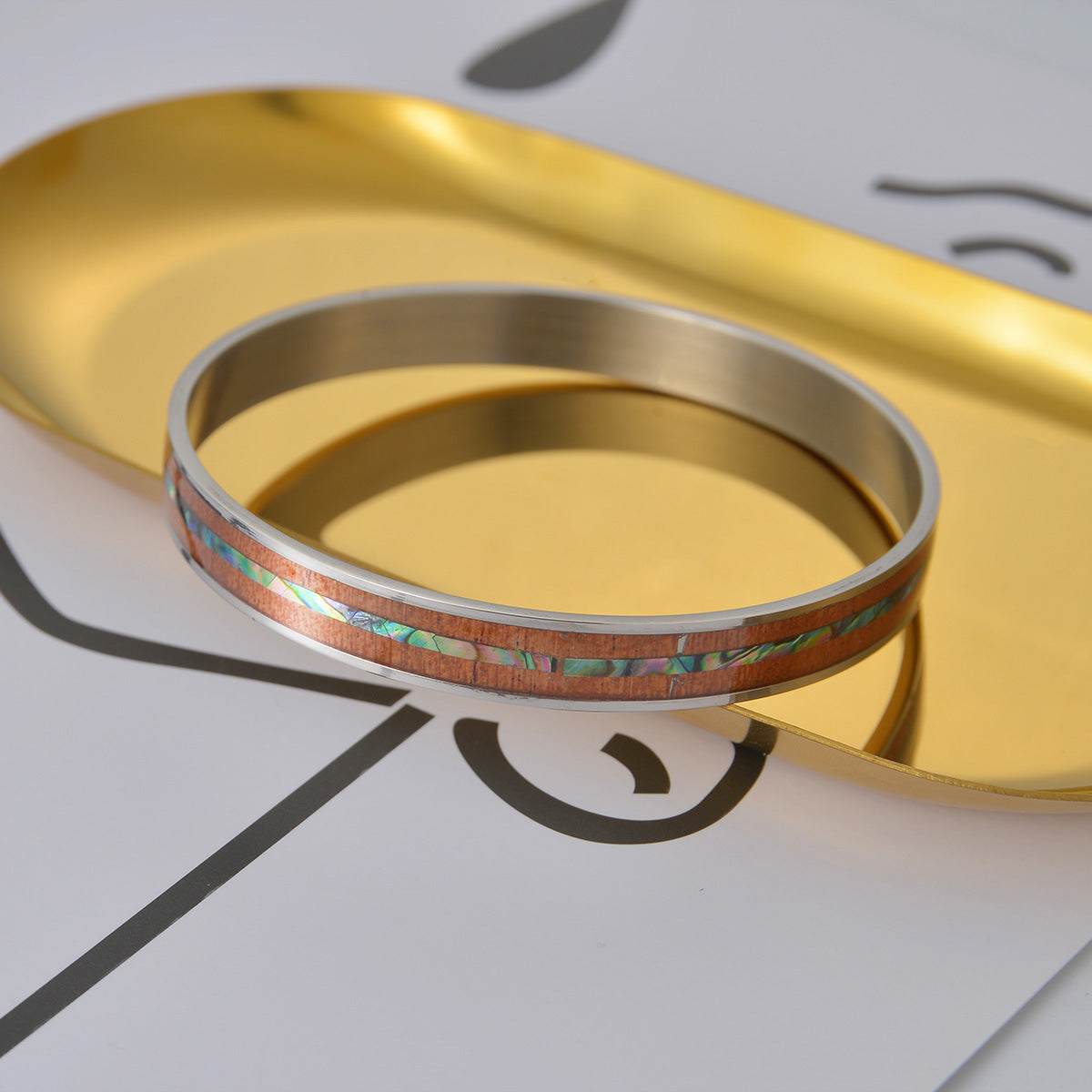 Explore the perfect blend of elegance and durability with our Cross Border European, American, and Amazon supply titanium steel closed loop bracelets. Elevate your style with the wholesale Acacia wood and abalone shell details that adorn these exquisite pieces.