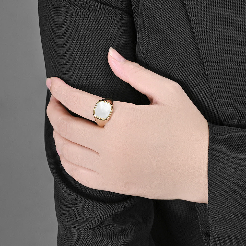 Discover the exquisite Cross-border European and American light luxury style square seal inlaid shell titanium steel ring men's and women's wedding ring commuting fashion wear accessories for men and women. This stunning ring perfectly embodies a blend of elegance and modern design, making it an essential accessory for both casual and formal occasions. Crafted from high-quality titanium steel, it offers durability while maintaining a sophisticated look that resonates with the light luxury style.