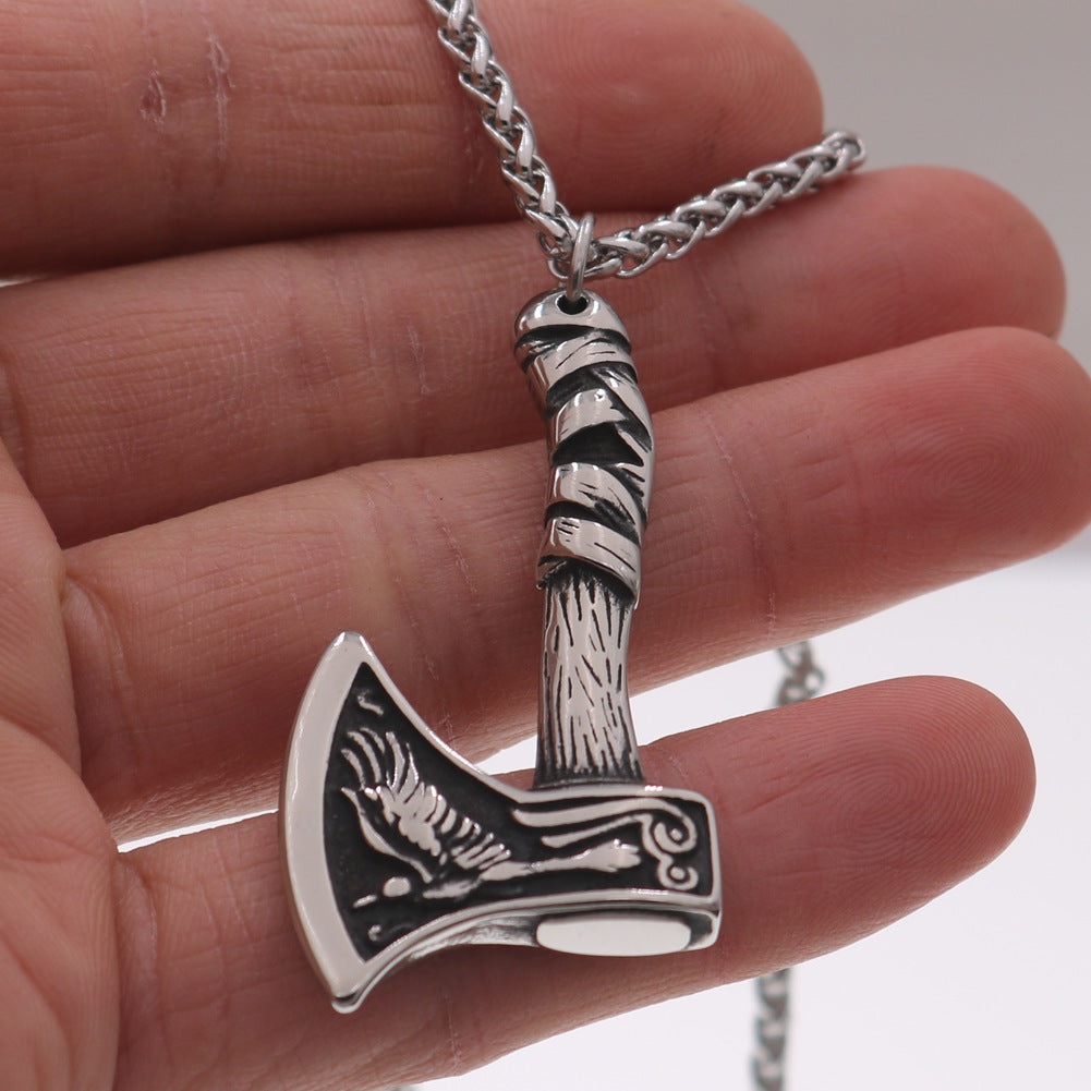 Viking Odin Axe Stainless Steel Pendant Necklace with Norse Crow Amulet