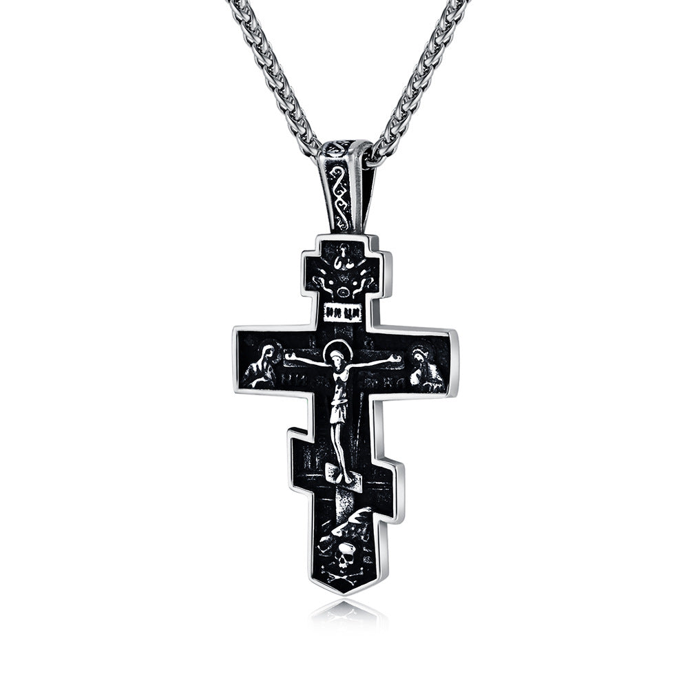 Introducing the Cross-border jewelry retro Dongzheng cross necklace men's personality old titanium steel cross pendant spot wholesale for men, a remarkable piece that embodies both style and individuality. Crafted from high-quality titanium steel, this cross necklace is designed for those who appreciate unique accessories. Whether you want to make a bold statement or add a subtle touch of elegance to your outfit, this pendant is the perfect choice.