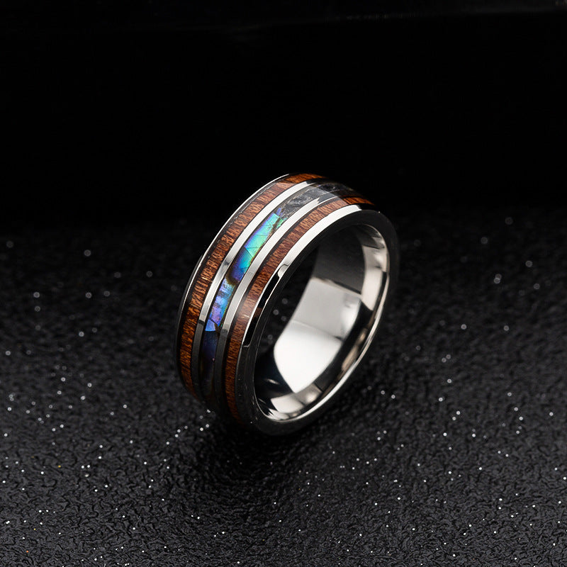 European Style Men's Titanium Steel Ring with Acacia Wood Grain and Abalone Shell