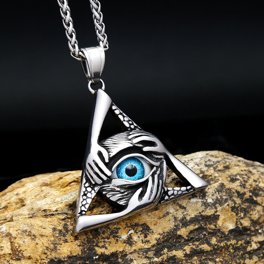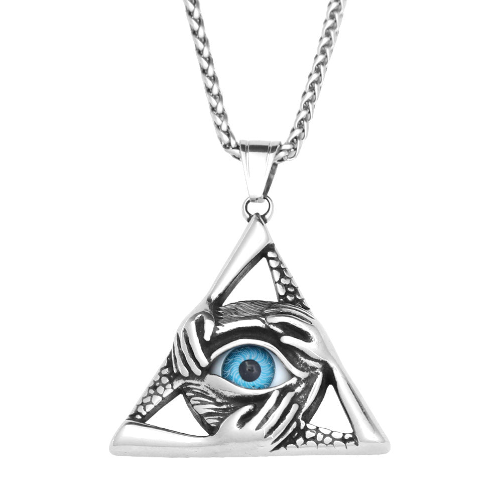 Elevate your style with the Cross-border Stainless Steel Devil's Eye Evil Hand Pendant Men's Hip Hop Triangular Eye Necklace European and American Jewelry for men. It's not just an accessory—it's a statement of your unique style and personality. Don’t miss out on this standout piece that perfectly blends cultural significance with contemporary fashion!