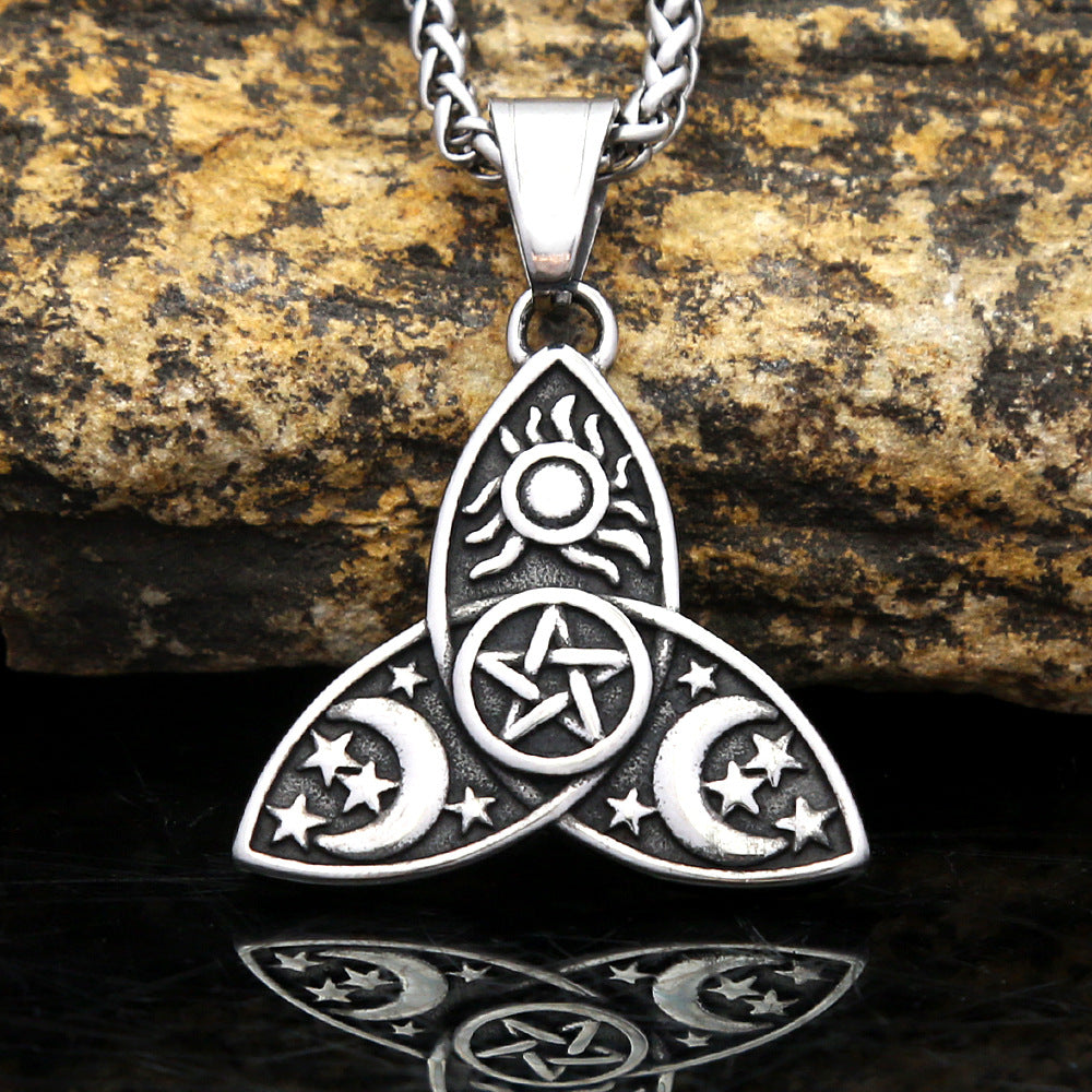 Discover the perfect blend of artistry and elegance with the Cross-border Sun Star Moon Stainless Steel Necklace Triple Moon Muse Triangle Star Pendant European and American Jewelry Wholesale for men. Order yours today and embrace the charm of celestial jewelry!
