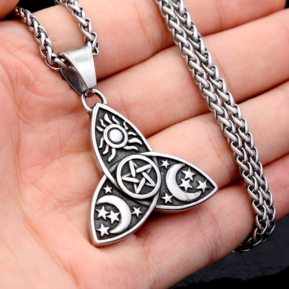 The Cross-border Sun Star Moon Stainless Steel Necklace Triple Moon Muse Triangle Star Pendant European and American Jewelry Wholesale for men is a stunning piece designed for the modern man who appreciates unique and meaningful jewelry. This exquisite necklace features a beautifully crafted pendant that combines the mystical symbols of the sun, moon, and stars, making it a perfect accessory for anyone who values celestial motifs.