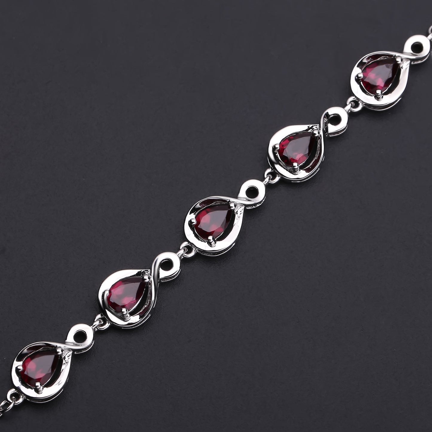 Meticulously crafted for a stunning look, this Pear Shape Rose Pomegranate Silver Bracelet adorns your wrist with five Pear Shape Rose Pomegranate stones for a brilliant and timeless piece. Perfect for any occasion, its elegant design will shine for years to come.