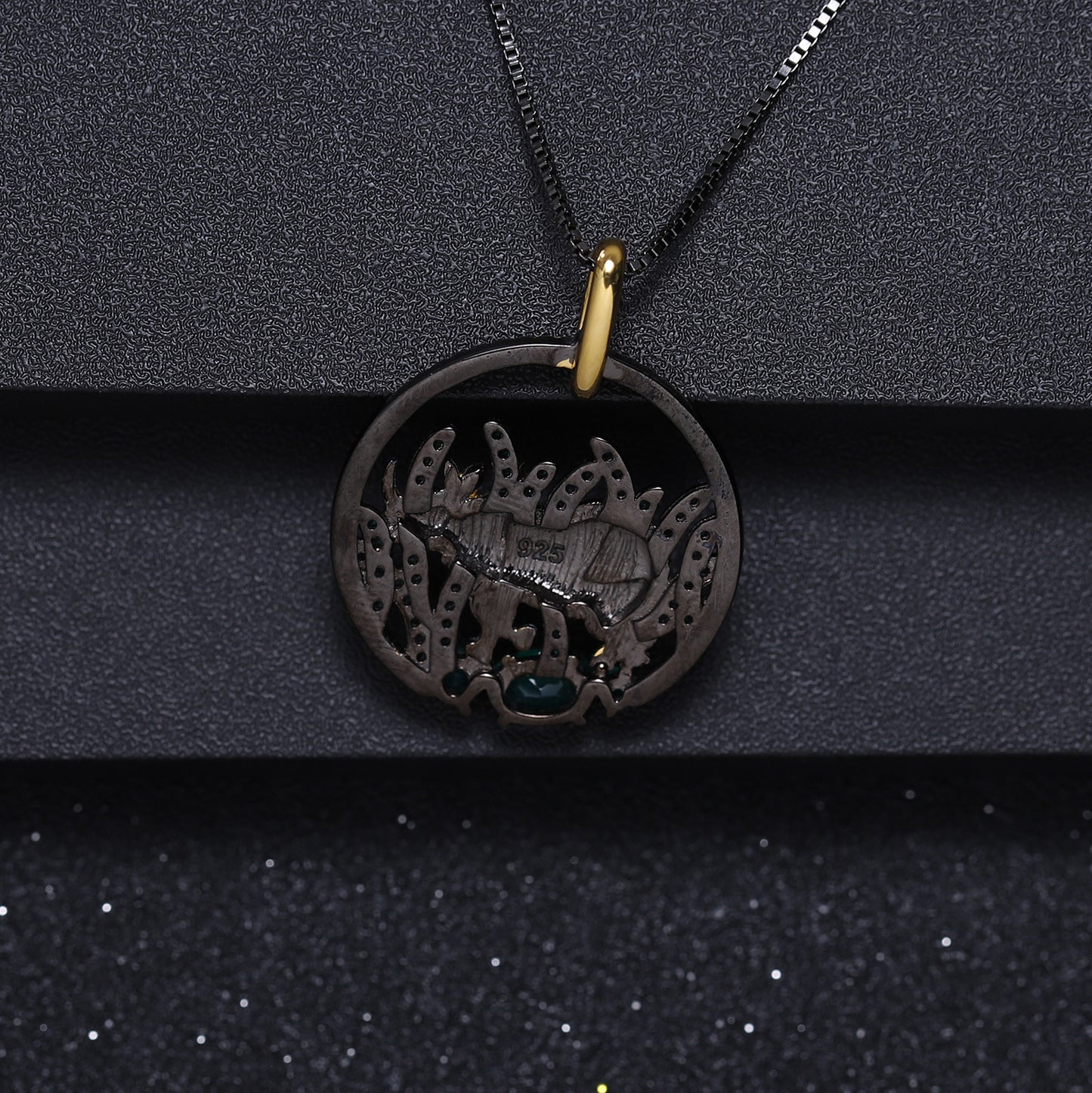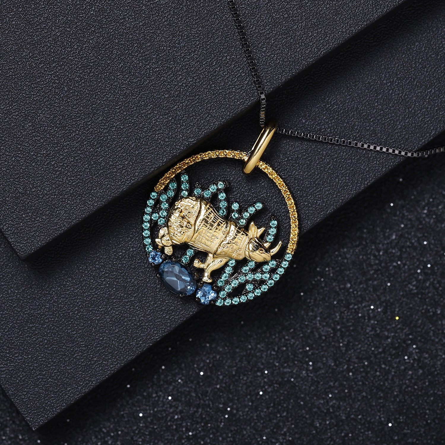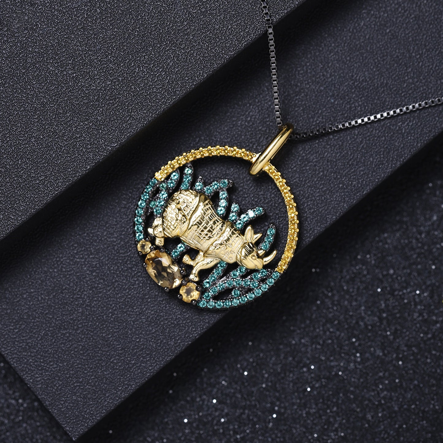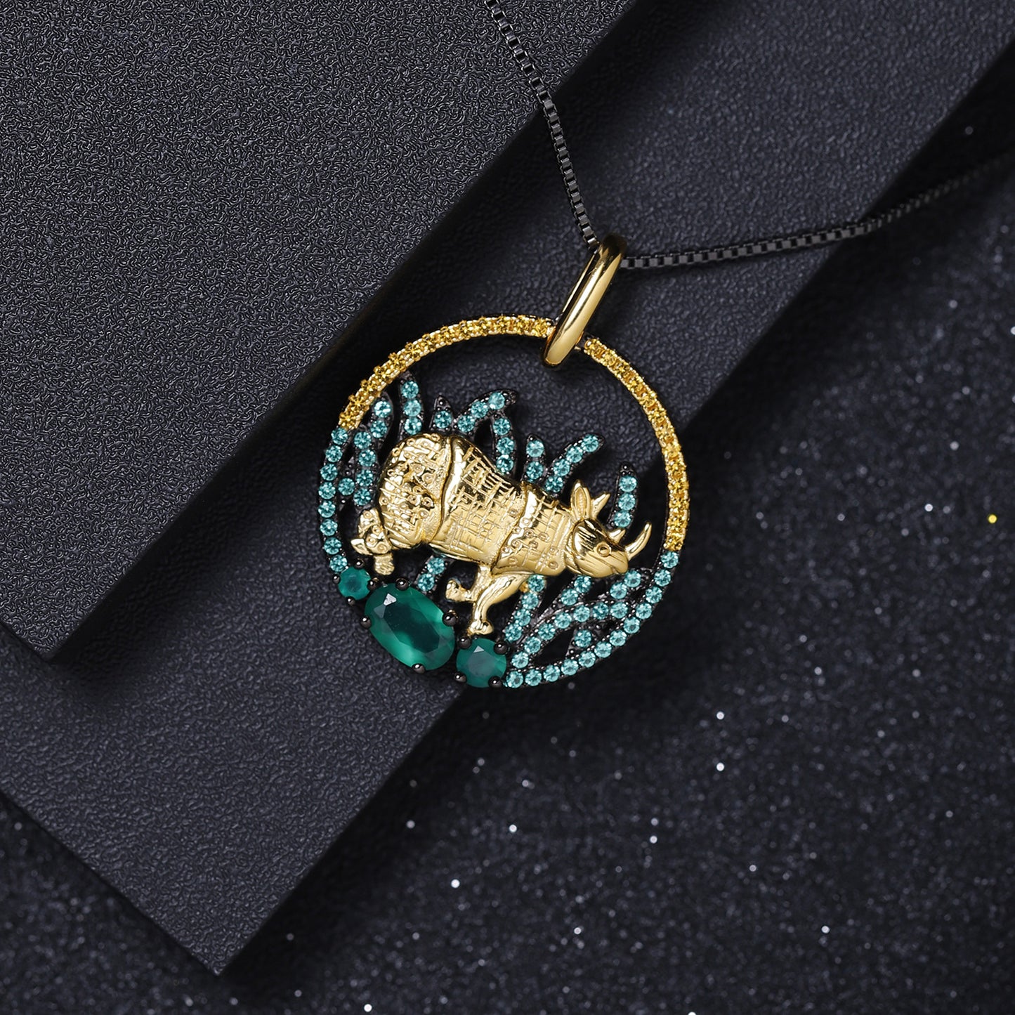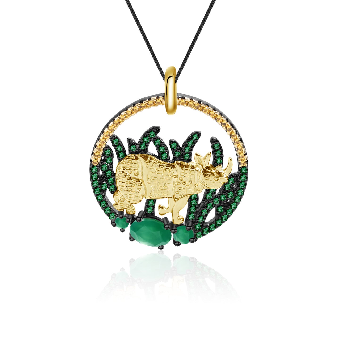 This Animal Natural Element Design Necklace is an elegant statement piece that catches the eye with its unique design. Feature a beautiful circle pendant with a rhino and Natural Green Agate, this luxurious necklace is sure to turn heads.