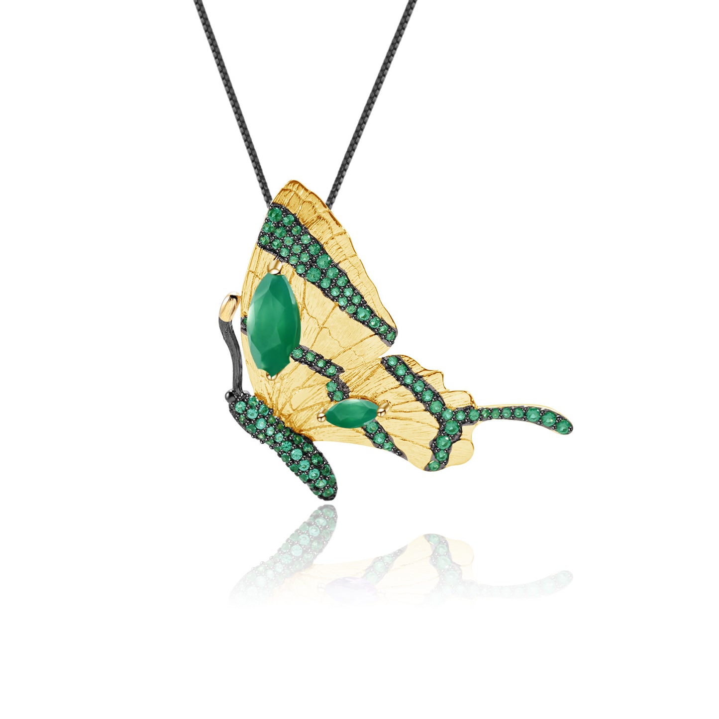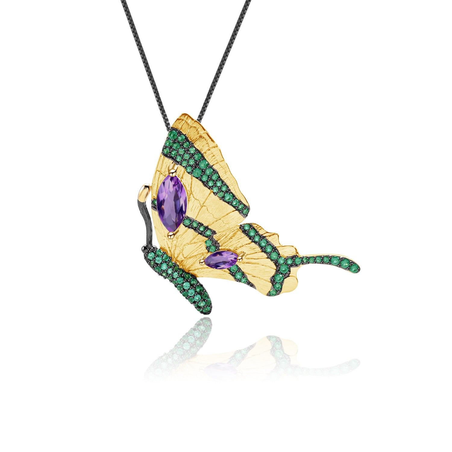 Vintage Style Brooch Pendant Dual-use Inlaid Natural Colourful Gemstone Flying Butterfly Silver Necklace for Women