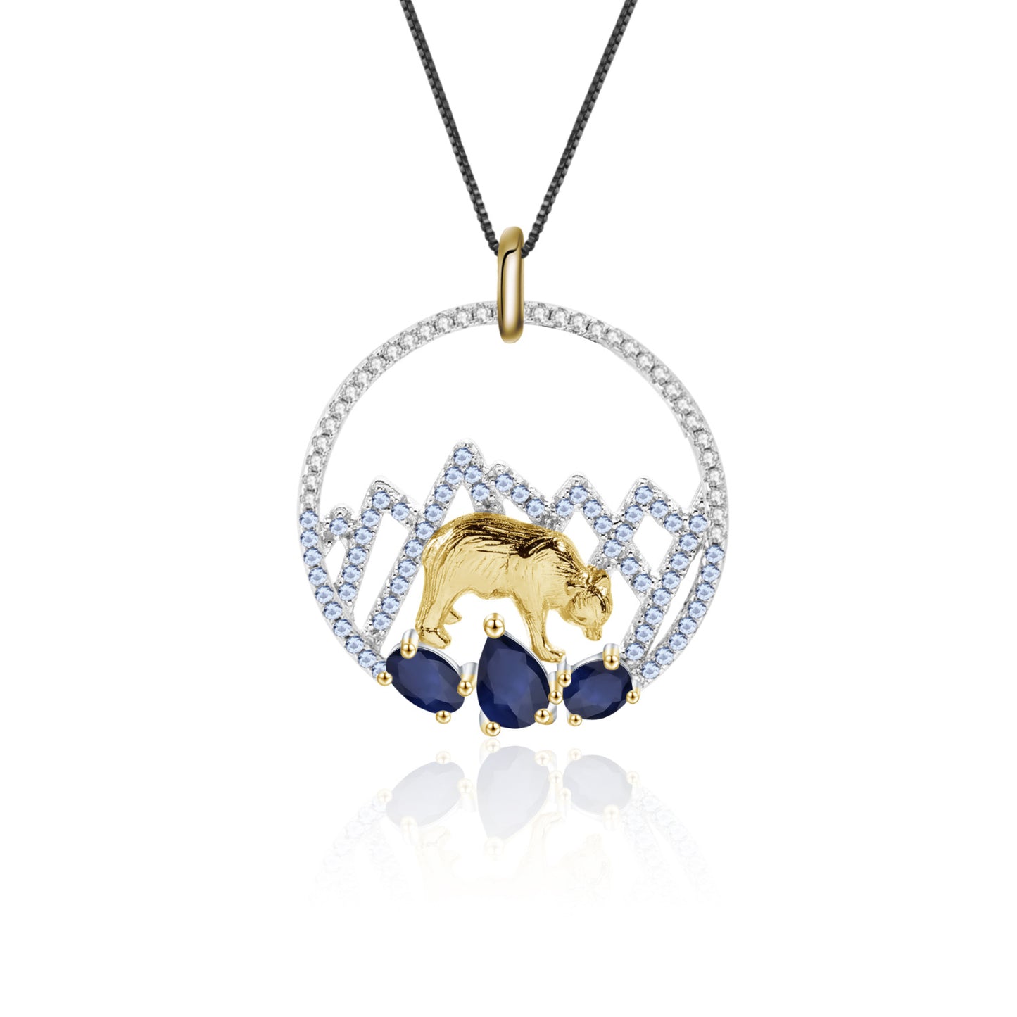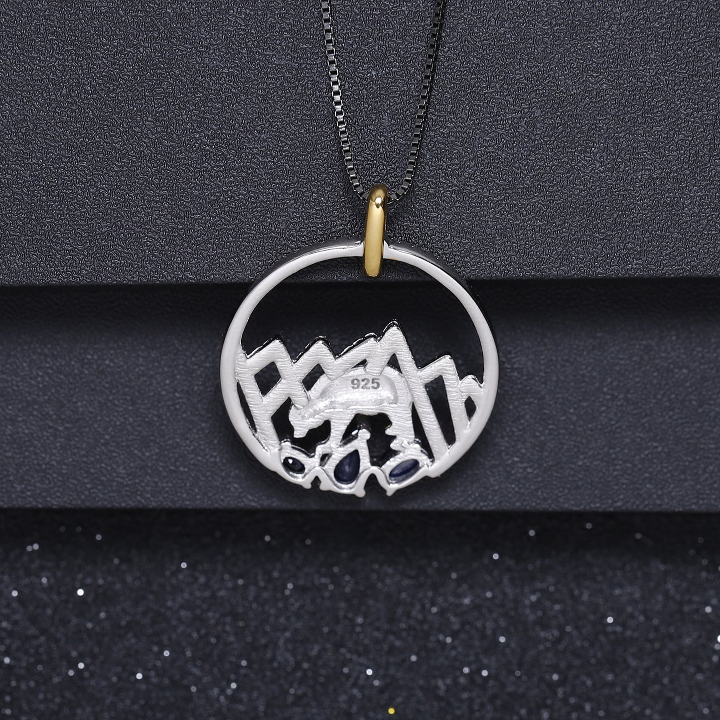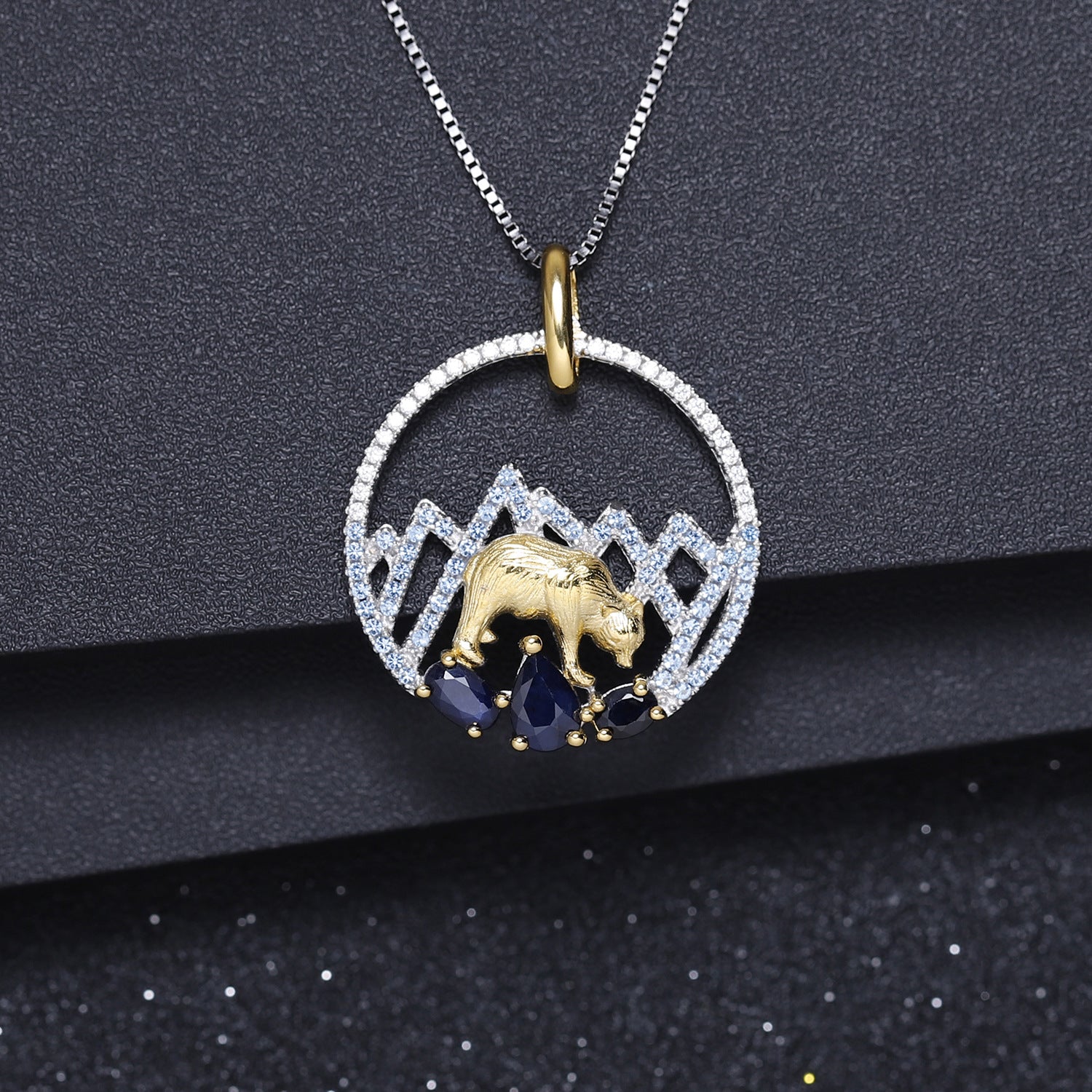 Animal Element Design Inlaid Sapphires Bear Circle Pendant Silver Necklace for Women