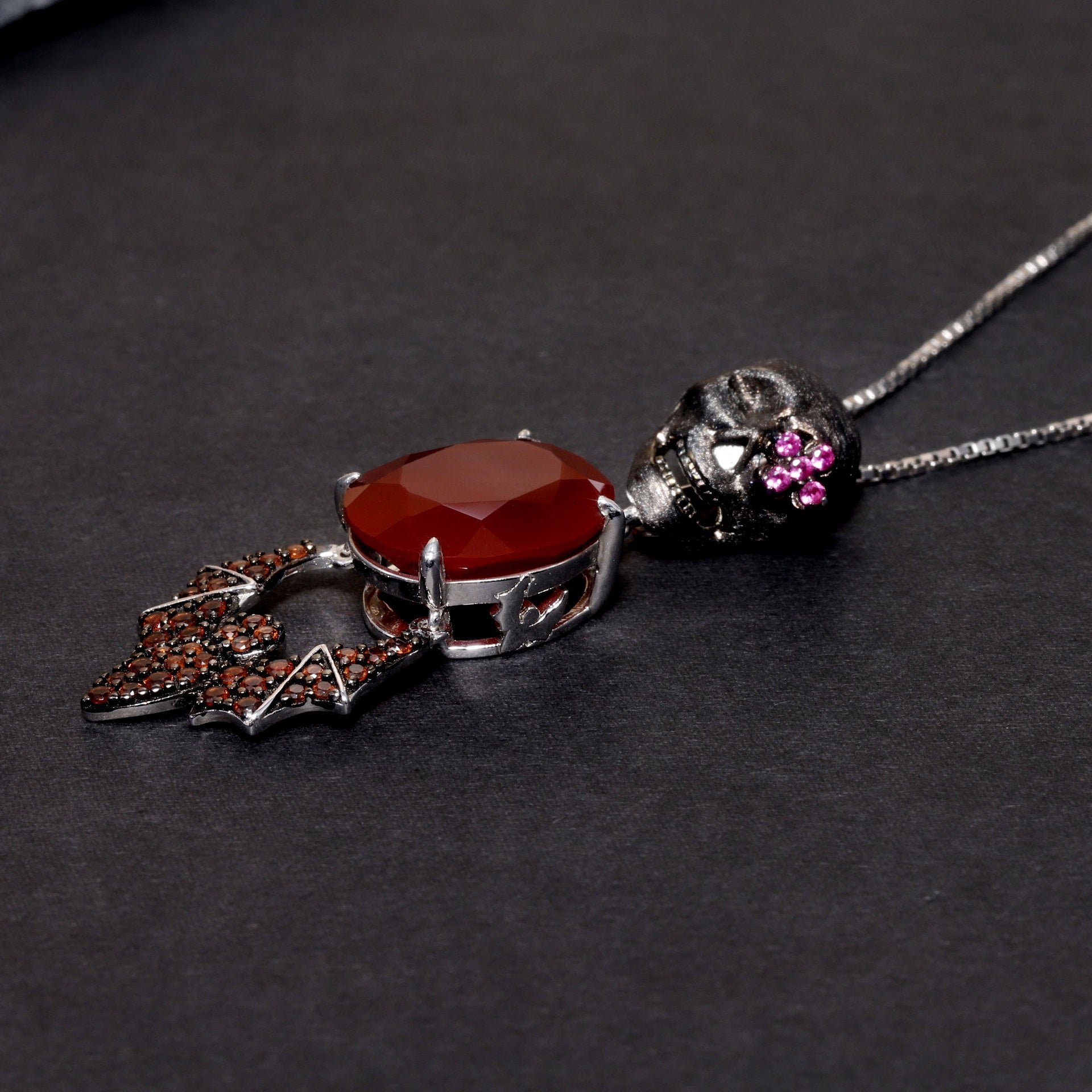 Dark Vintage Skull Bat Design with Red Agate Pendant Silver Necklace for Women
