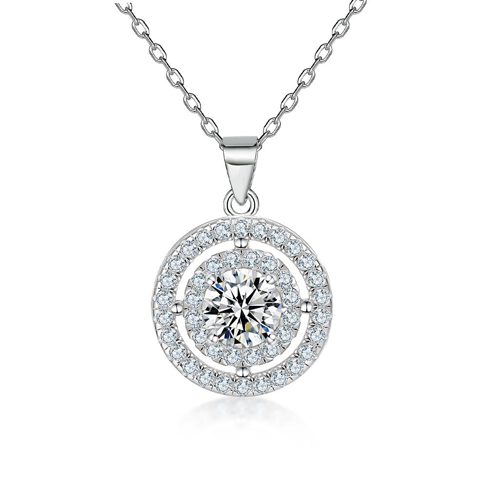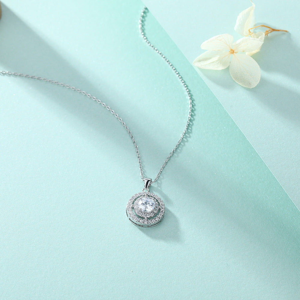 This Round Zircon Soleste Halo Pendant Silver Necklace for Women features an exquisitely crafted circle pendant with a Round Zircon surrounded by a double Soleste Halo. The dazzling combination of these elements makes for an eye-catching piece, perfect for any occasions.