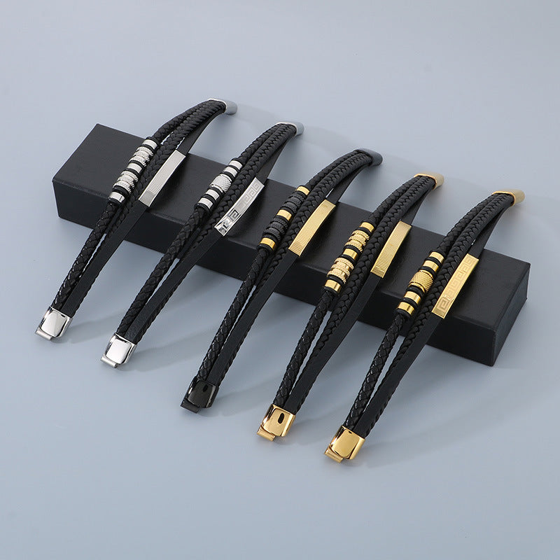 The bracelet combines titanium steel with woven stainless steel strands in a curved profile, accented by a multi-layer leather detail that adds depth and character. The magnet buckle ensures quick closure and a sleek finish.