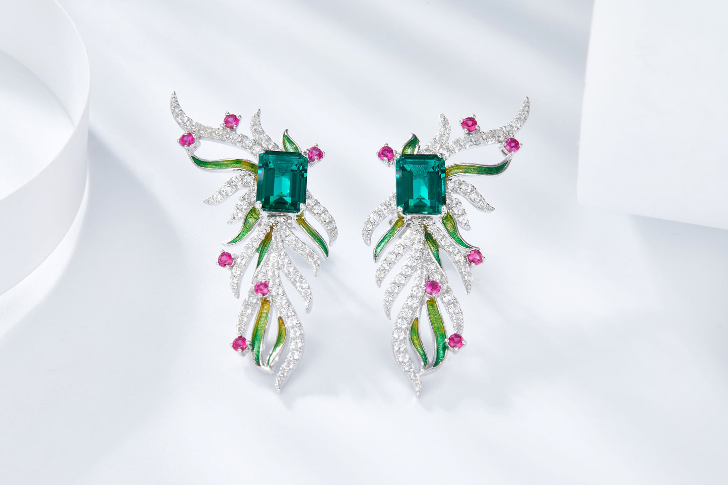 This Emerald Colour Phoenix Wings Enamel Silver Drop Earrings brings out a unique combination of style and modernity featuring a phoenix wing design with a lab-created emerald stone at its center, set within vibrant enamel emerald colour , Crafted with sterling silver. A perfect way to add a touch of grace and exuberance to any woman's wardrobe.