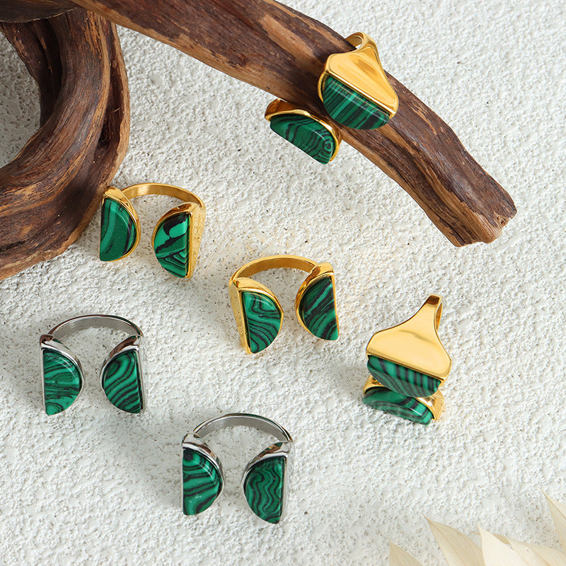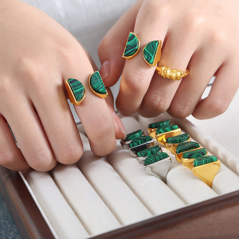 Peacock Turquoise Double Semicircle Titanium Steel Ring - Light Luxury Women's Jewelry