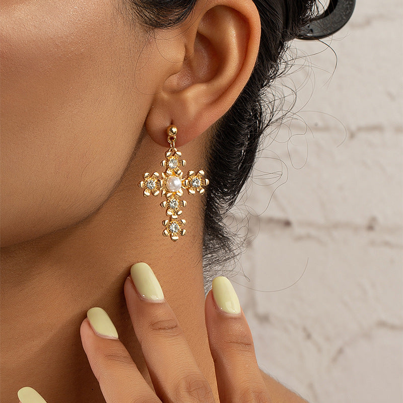 European and American Vienna Verve Metal Cross Earrings with Flower Design