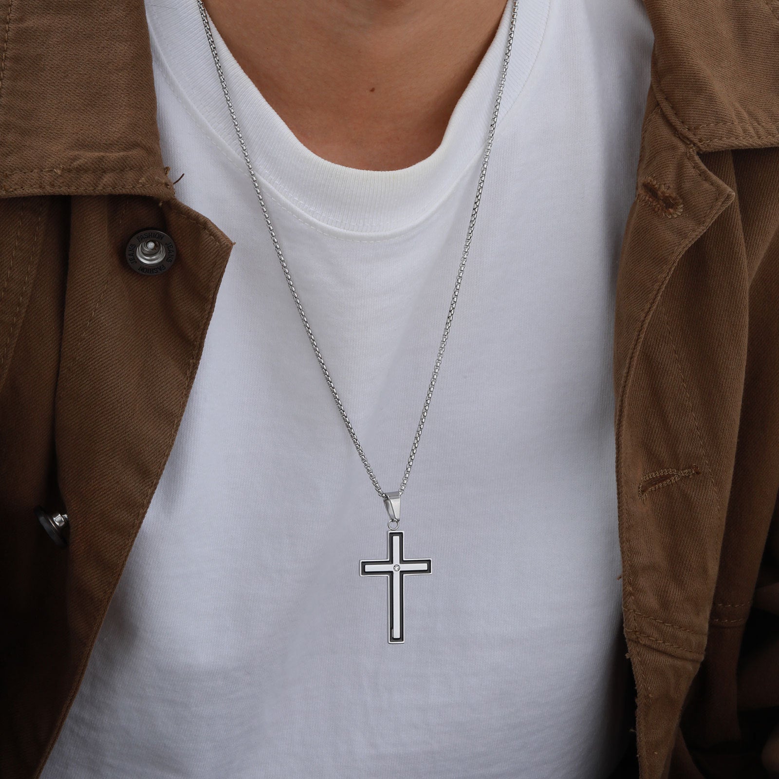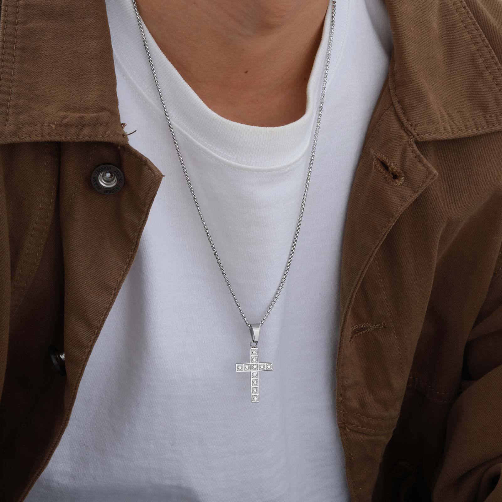 • Classic cross pendant on a sleek necklace, blending Western style with modern masculine aesthetics.