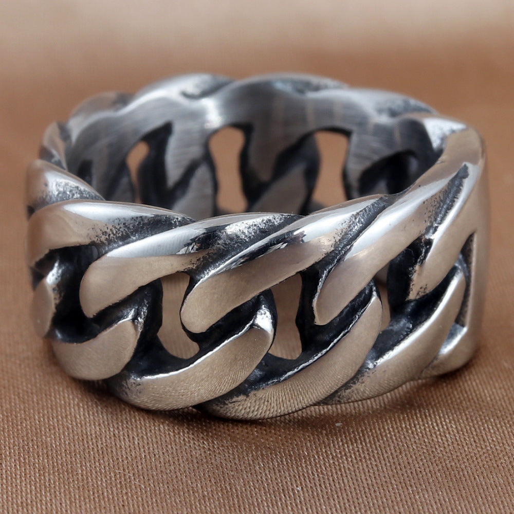 Introducing the European and American Jewelry Titanium Steel Locomotive Chain Ring – a stunning blend of retro charm and modern aesthetics, designed for the contemporary man who values both style and substance.