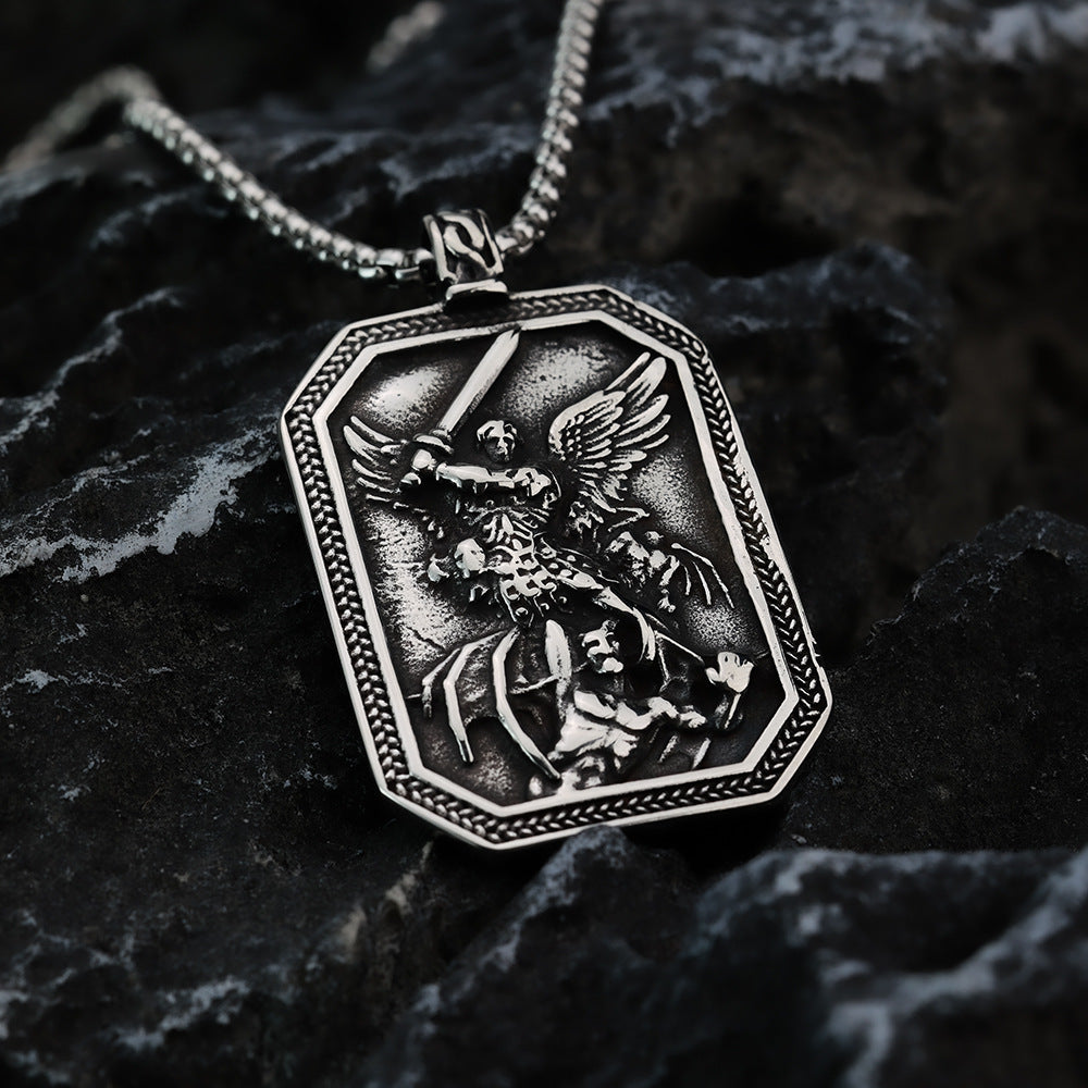 Elevate your style with our European and American jewelry titanium steel pendant men's stainless steel necklace hip-hop style retro angel knight exorcism tag for men. This striking piece is designed for those who appreciate bold fashion statements combined with a touch of artistic craftsmanship.