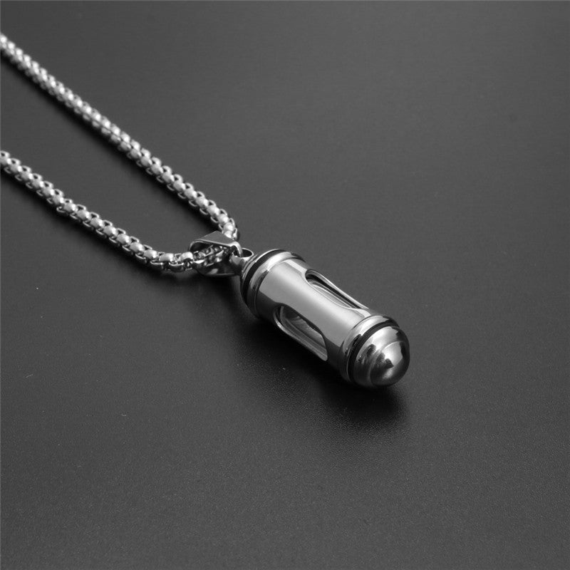 Discover a unique blend of elegance and functionality with our European and American jewelry titanium steel perfume bottle pendant. This trendy gift necklace is meticulously designed for the modern man who appreciates both style and practicality.