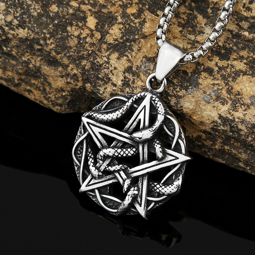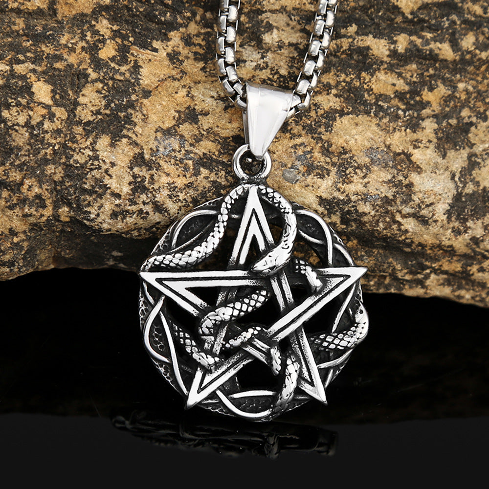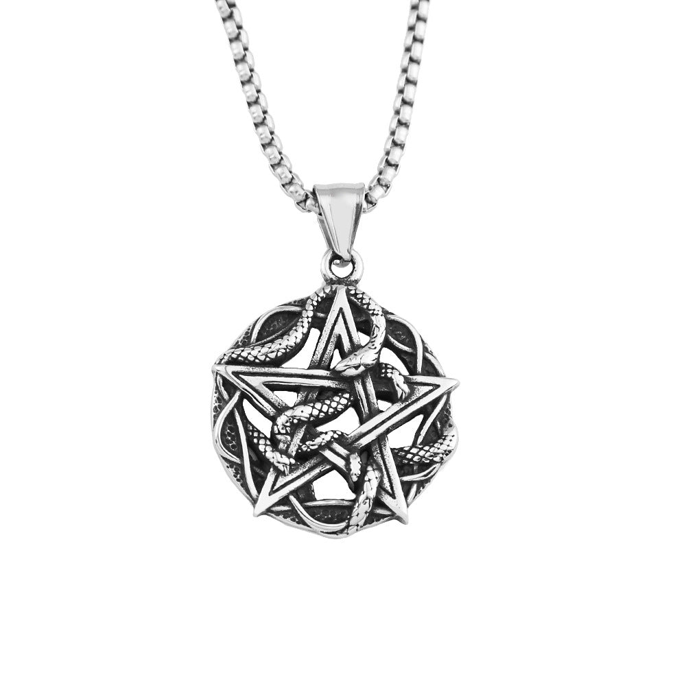 Elevate your accessory game with the European and American retro five-pointed star snake plate hollow stainless steel pendant men's fashion creative titanium steel necklace jewelry spot for men. Order yours today and embrace a blend of fashion and functionality!