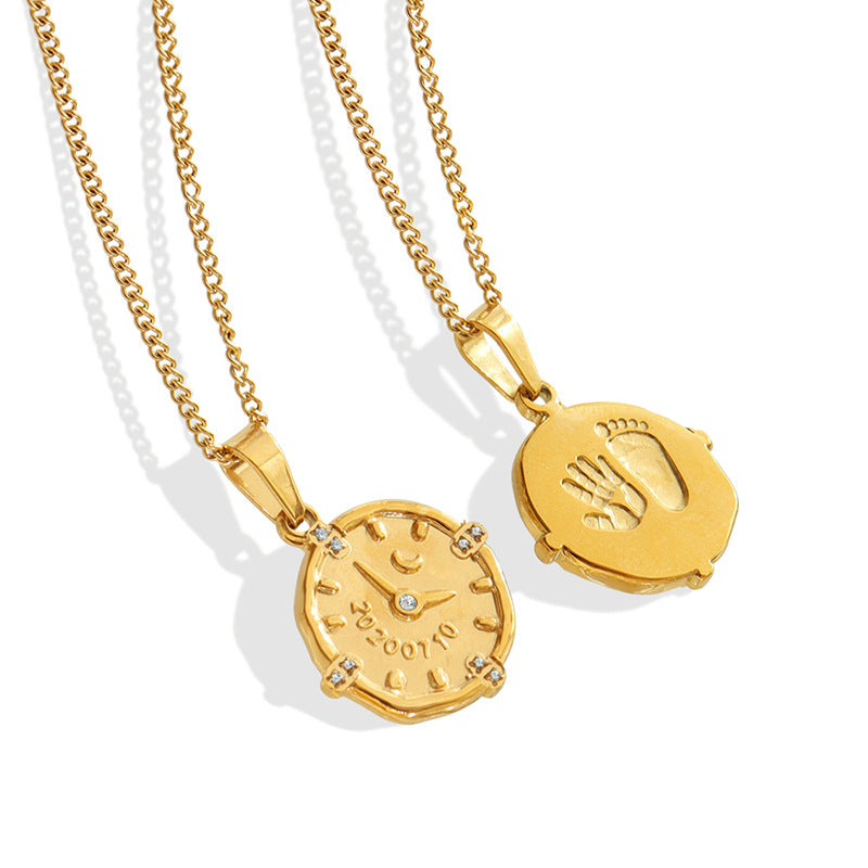 Vintage Zircon Clock Time Necklace with Hand and Foot Imprint Pendant