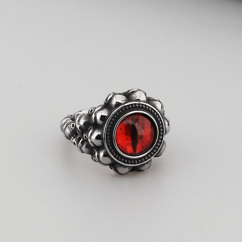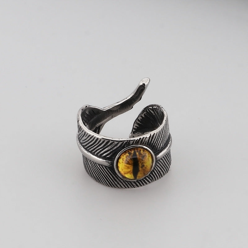Punk-Style Devil's Eye Ring with Exaggerated Red/Green Design, Skull Feather Titanium Steel for Men