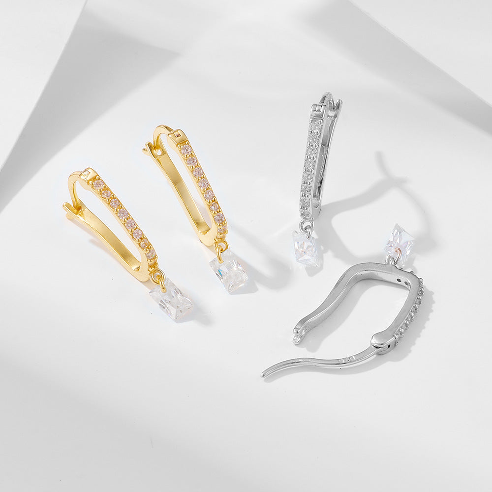 These stunning Radiant Cut Zircon Pendant U Shaped Sterling Silver Hoop Earrings exude luxury and elegance. Showcasing a delicately Radiant Cut zircons pendant and a sleek and sophisticated U-shape hoop design, these hoop earrings feature sophisticated craftsmanship and timeless chic. A classic piece for a truly radiant look.