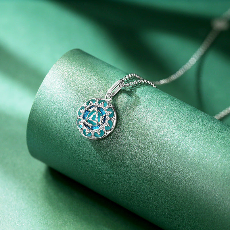 Lotus Pattern Series Green Turquoise Enamel Circle Pendant Silver Necklace for Women