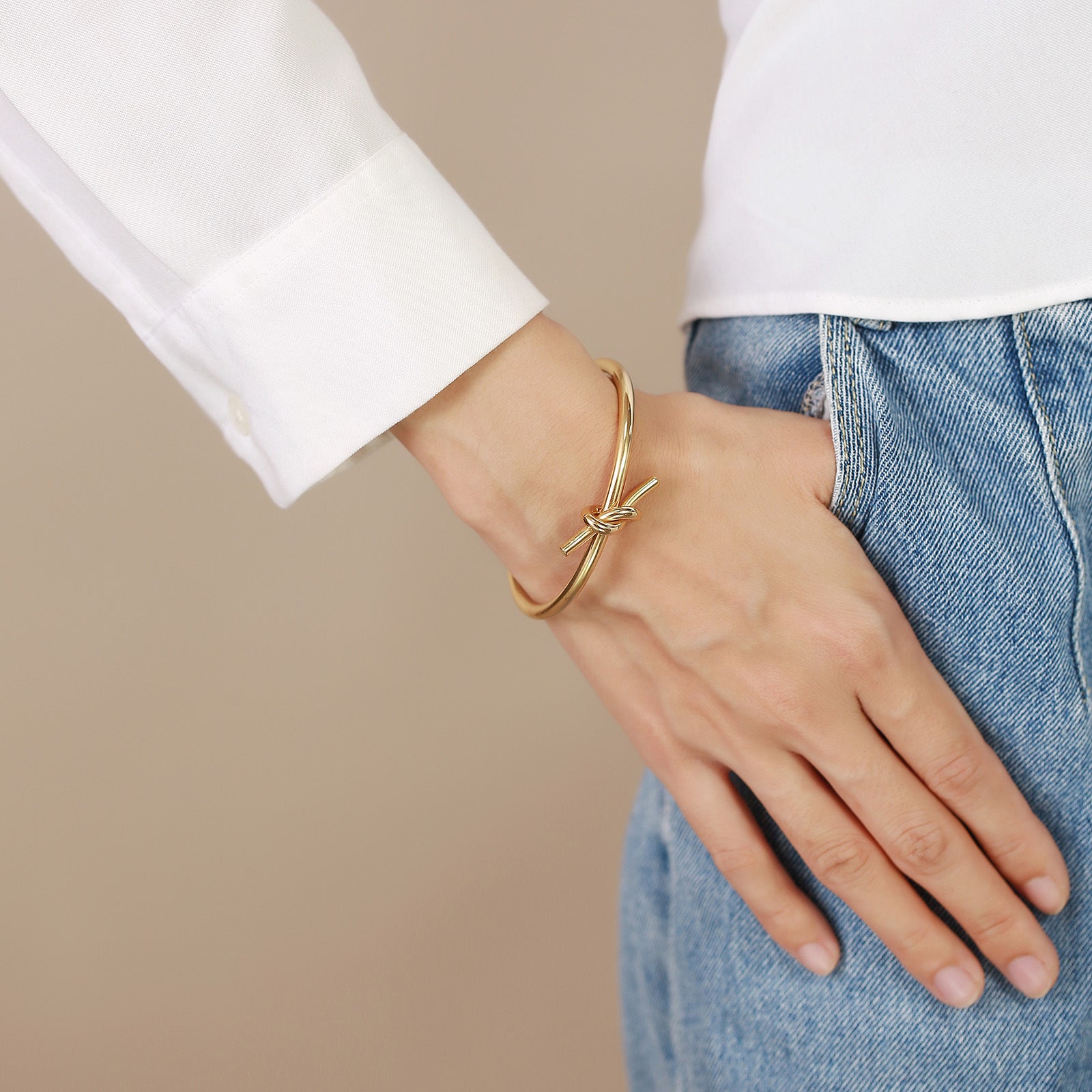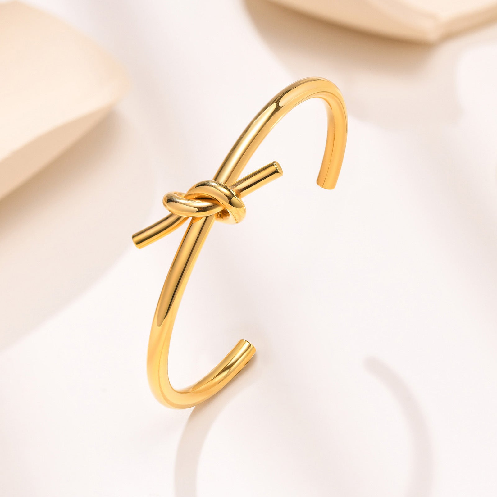 This golden women's accessory is not only a fashionable statement but also an opportunity to elevate your jewelry collection. Whether you're looking to make a personal purchase or stock up for your store, our foreign trade, stainless steel knotted simple opening bracelet meets all your needs. Embrace the blend of style and substance, and let this bracelet be your go-to choice for any occasion.