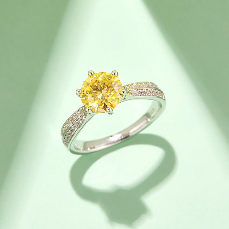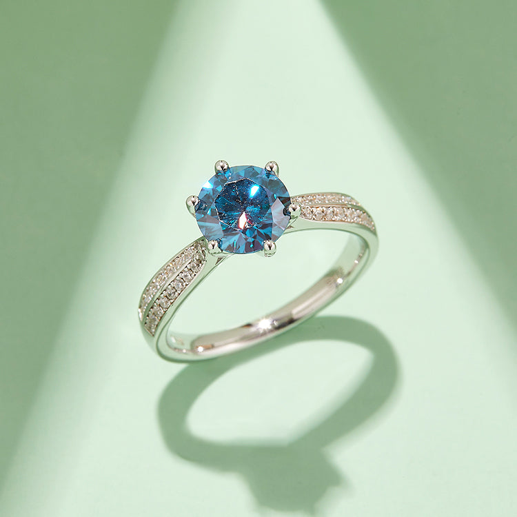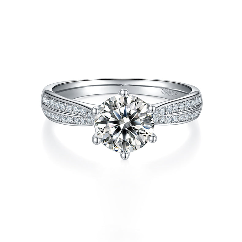 This charming and dainty ring is designed for women who appreciate the beauty of a delicate and colourful jewelry piece. It features a 1.5-carat Moissanite stone, and the cutting and polishing technology of the stone makes it emit dazzling light. Multiple small Moissanite stones are inlaid on the ring, making the entire ring more sparkly.