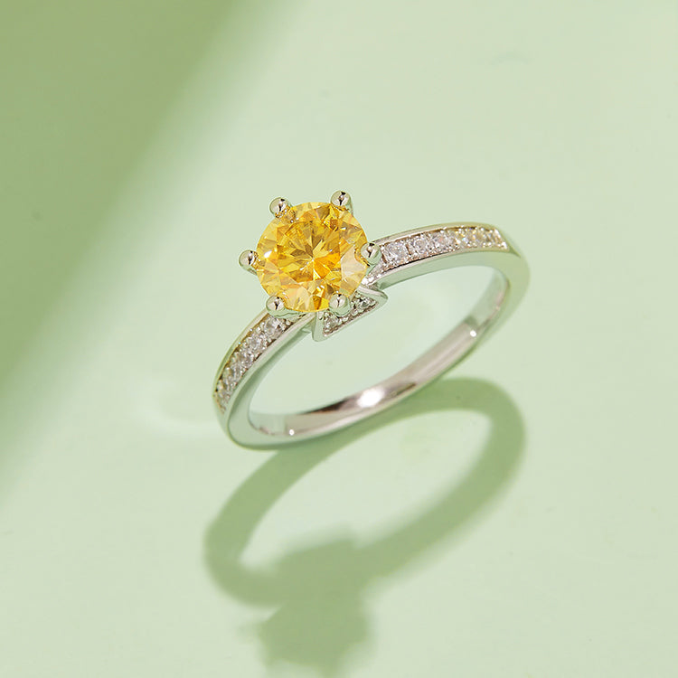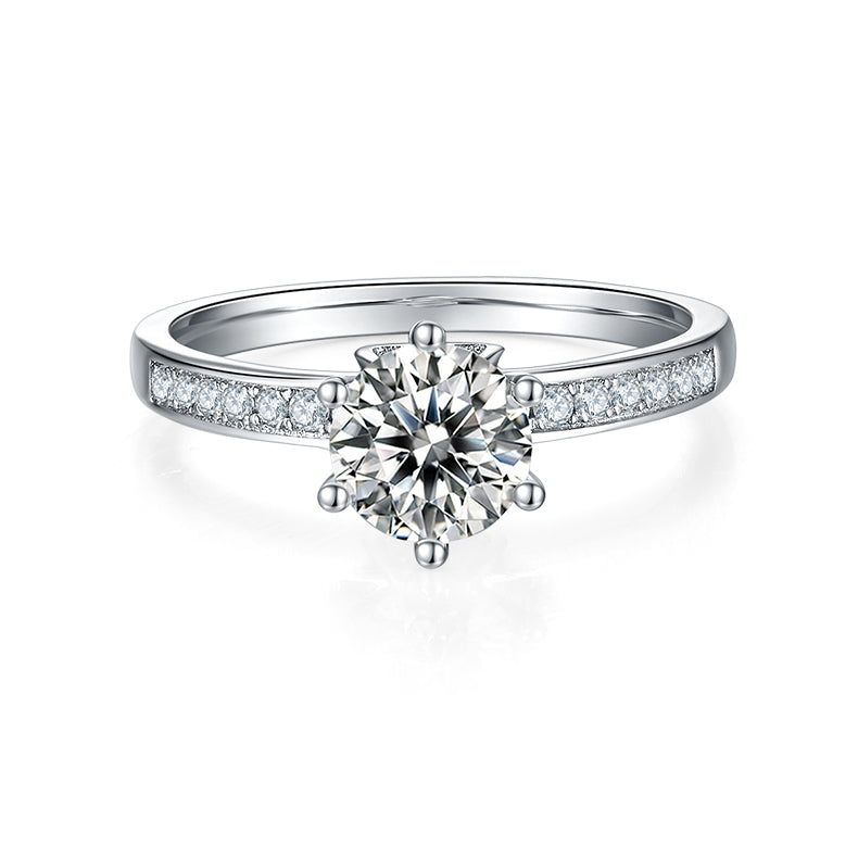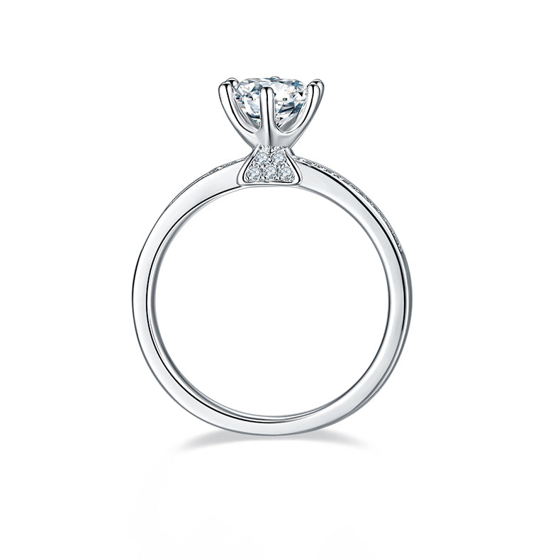 This ring uses a round cut 1.0-carat Moissanite , with high colour and purity, sparkly in any occasion. The unique triangular six prongs design with small Moissanite is the characteristics of this ring, making it more fanshion and elegance.